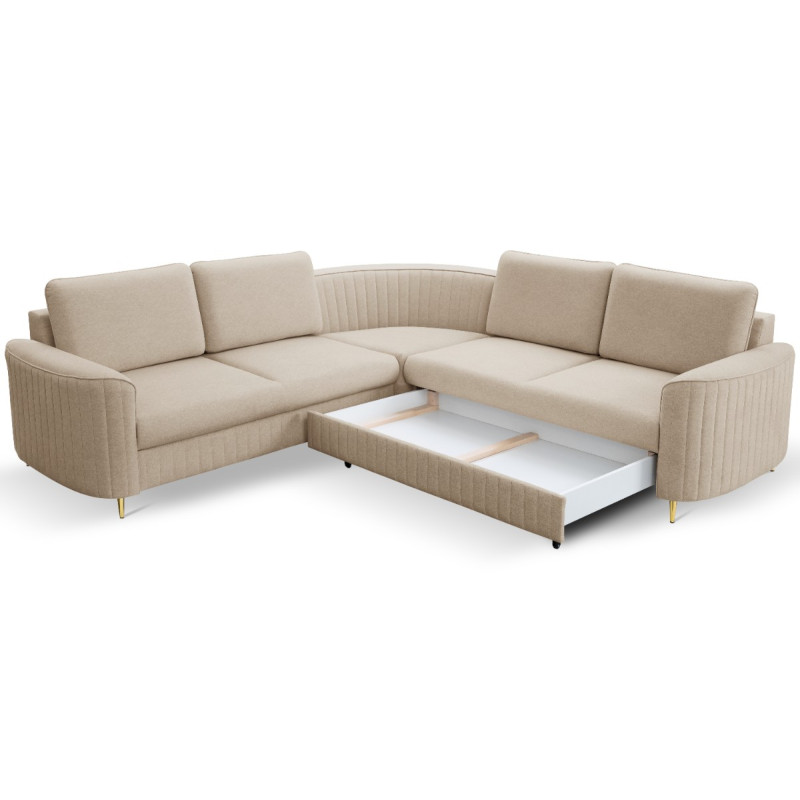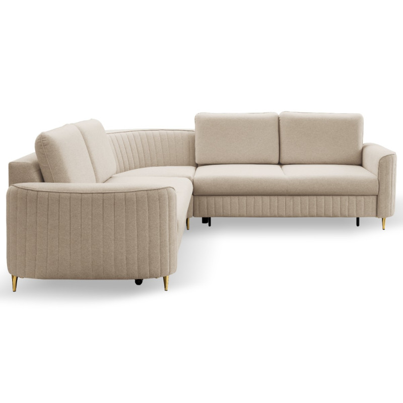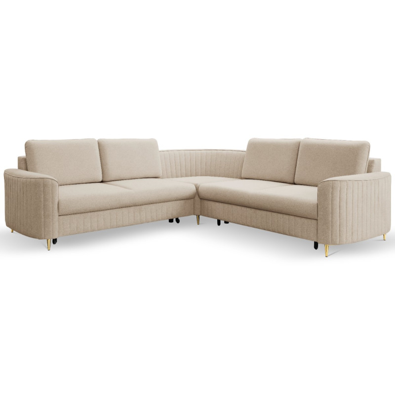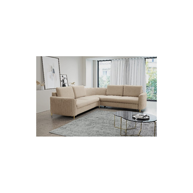 Piękny narożnik LAREN w stylu glamour z modnymi, ozdobnymi przeszyciami. Elegancja i styl podkreślona metalowymi nóżkami w kolorze złotym. Ten model znajdzie zastosowanie w przestronnych aranżacjach, przyciągając spojrzenia.