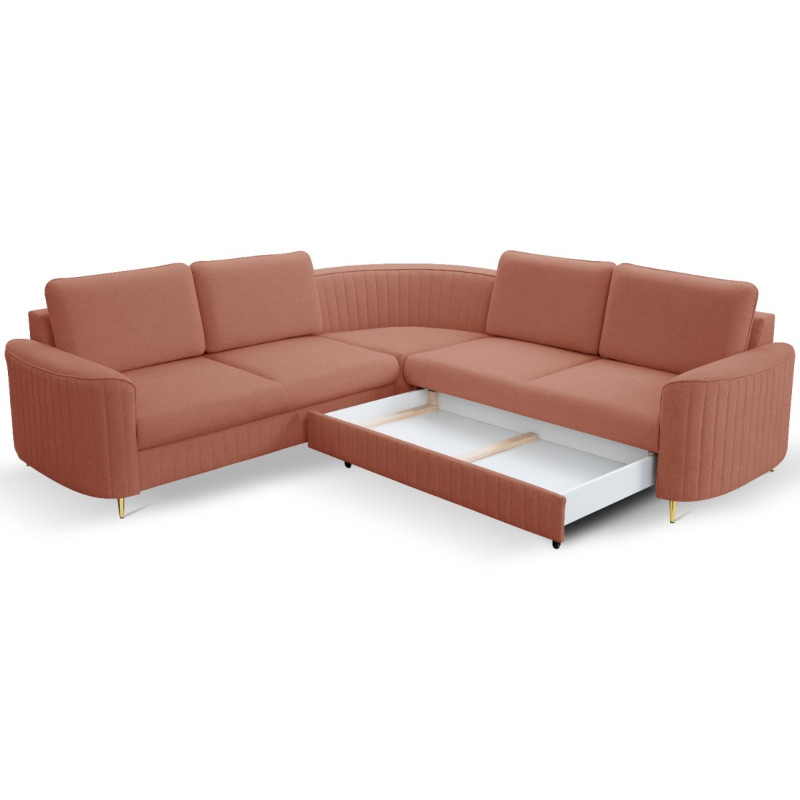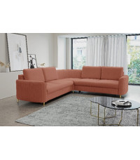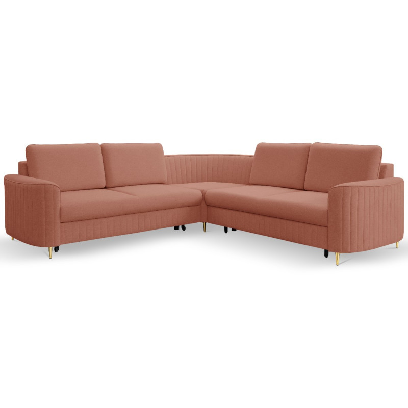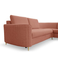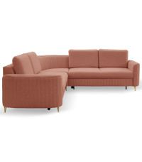 Piękny narożnik LAREN w stylu glamour z modnymi, ozdobnymi przeszyciami. Elegancja i styl podkreślona metalowymi nóżkami w kolorze złotym. Ten model znajdzie zastosowanie w przestronnych aranżacjach, przyciągając spojrzenia.