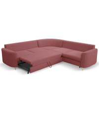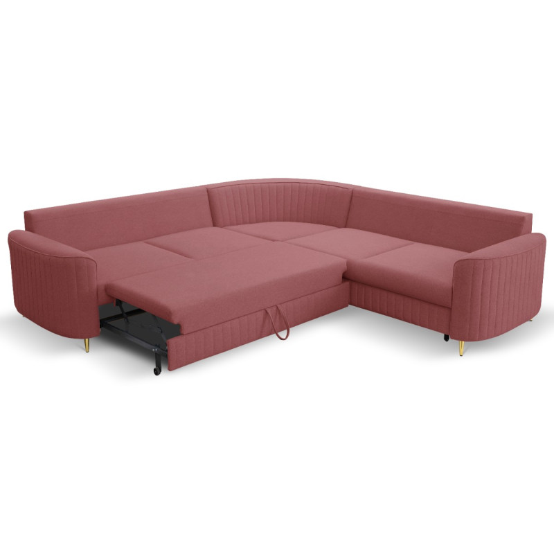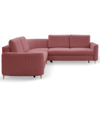 Piękny narożnik LAREN w stylu glamour z modnymi, ozdobnymi przeszyciami. Elegancja i styl podkreślona metalowymi nóżkami w kolorze złotym. Ten model znajdzie zastosowanie w przestronnych aranżacjach, przyciągając spojrzenia.