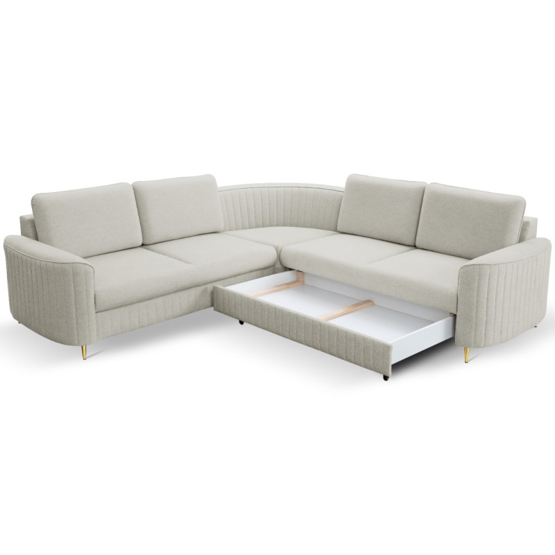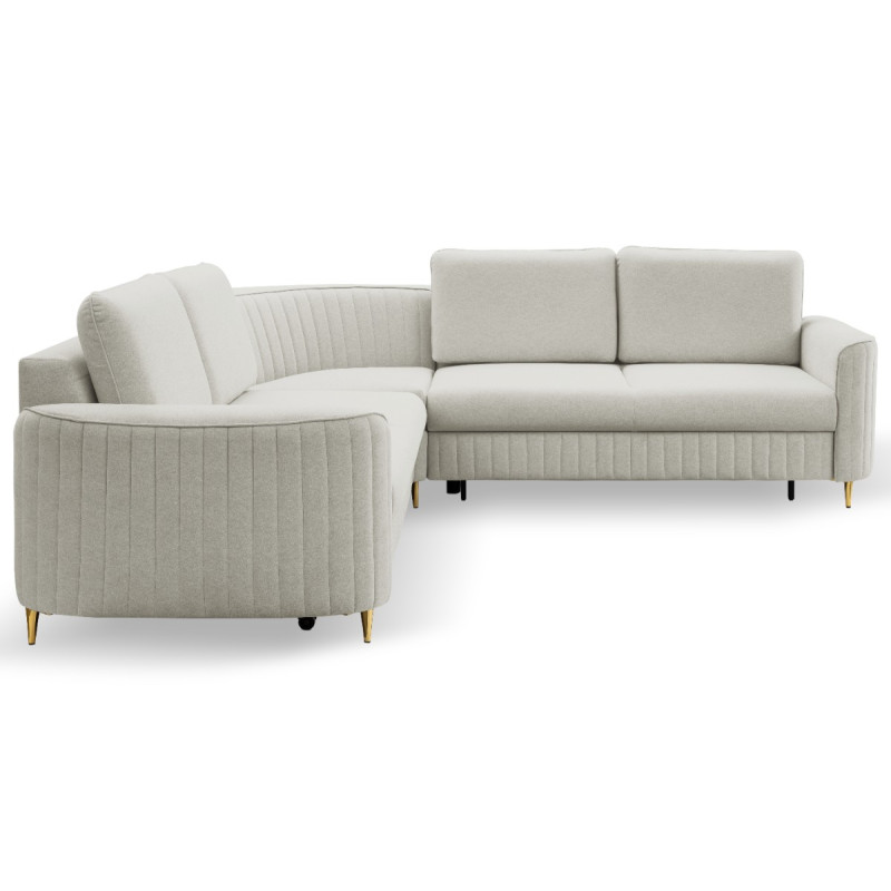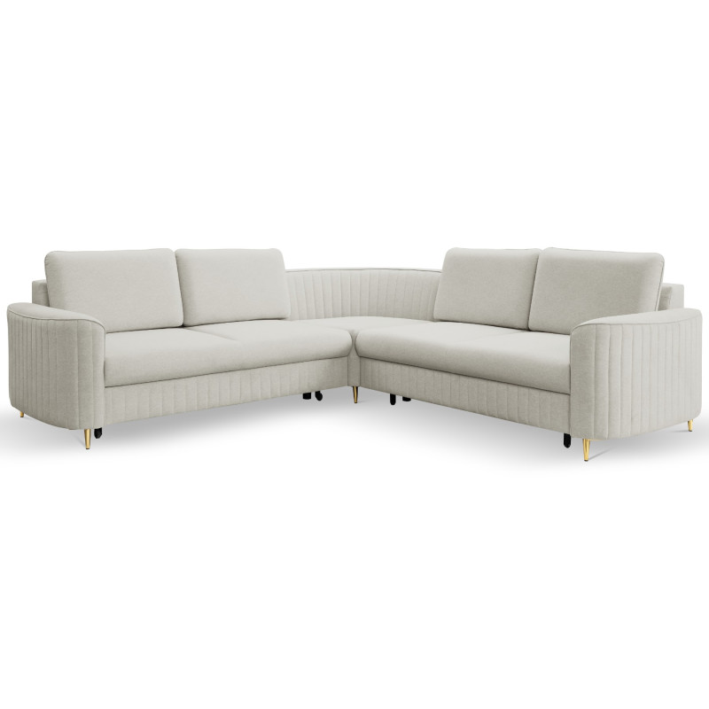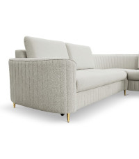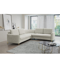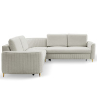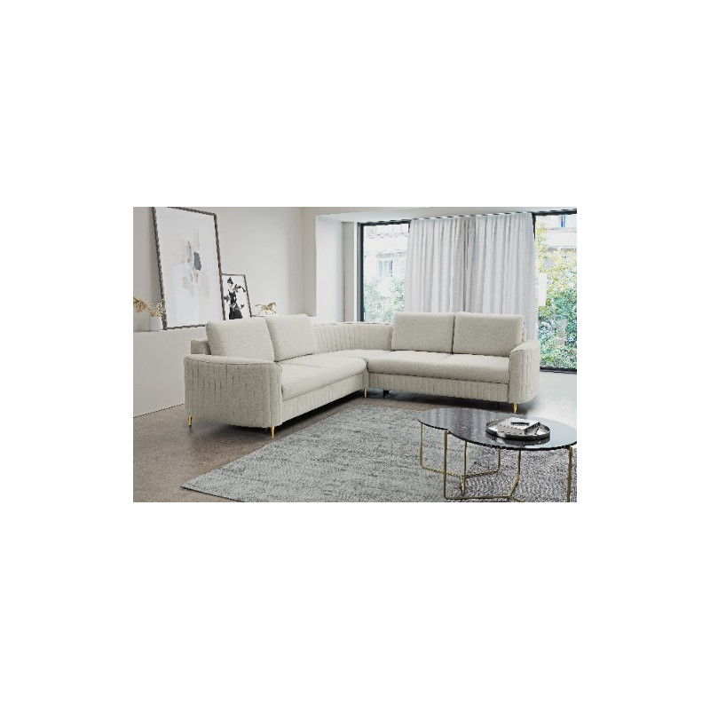 Piękny narożnik LAREN w stylu glamour z modnymi, ozdobnymi przeszyciami. Elegancja i styl podkreślona metalowymi nóżkami w kolorze złotym. Ten model znajdzie zastosowanie w przestronnych aranżacjach, przyciągając spojrzenia.