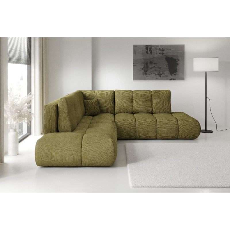 Narożnik SOHO II FLOW 12 PRAWY to doskonałe połączenie nowoczesnego designu i naturalnego koloru — zieleni przełamanej odcieniem ziemi i mchu. Ten odcień nie narzuca się, ale wprowadza do wnętrza przyjemne ukojenie, które łatwo dopasować do jasnych, stonowanych przestrzeni. Z wymiarami 266,5 × 88 × 266,5 cm i funkcją spania o powierzchni 206 × 127 cm, mebel oferuje dużo przestrzeni zarówno do codziennego relaksu, jak i do snu. Siedzisko zbudowane jest na solidnym stelażu z drewna sosnowego i płyty wiórowej, z dodatkiem pianki PUR i pasów gumowych, co gwarantuje komfort i trwałość. Oparcie wypełnione silikonem i luźne poduszki zapewniają odpowiednie wsparcie dla pleców. Tapicerowane plecy dają swobodę ustawienia narożnika w każdym miejscu, a praktyczny pojemnik na pościel pozwala na wygodne przechowywanie. Całość dopełniają czarne, niskie nóżki z tworzywa sztucznego.