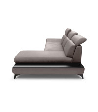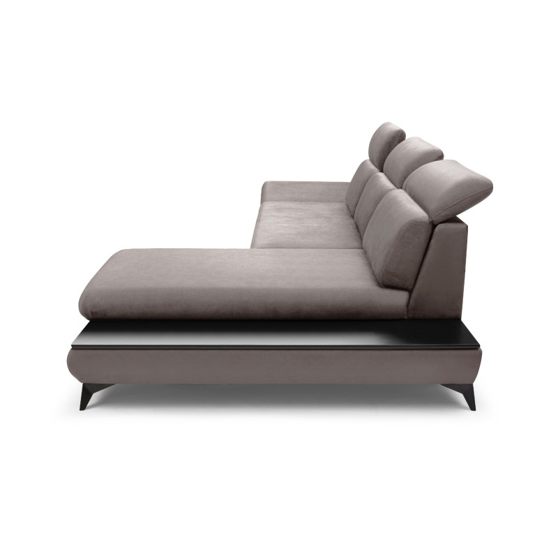 Stylowy narożnik TITAN z tkaniny Fancy 96 w szarobrązowym kolorze. Wyposażony w regulowane zagłówki i podłokietniki, praktyczny pojemnik na pościel oraz wygodną funkcję spania z automatem. Stabilny i komfortowy mebel do nowoczesnych wnętrz.