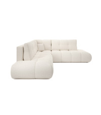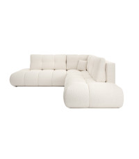 Prawy narożnik Soho II w tkaninie Curio 09 prezentuje się wyjątkowo elegancko dzięki jasnej, subtelnej bieli o ciepłym tonie. Oferuje powierzchnię spania 206 x 127 cm oraz pojemnik o wymiarach 104 x 61 x 19,5 cm, który sprawdzi się idealnie na przechowywanie pościeli. Konstrukcja opiera się na solidnym stelażu z drewna i płyty wiórowej, wypełnionym pianką PUR T-3042 i T-2542 oraz otulonym miękką owatą. Oparcie wypełnione jest silikonem, co zapewnia wyjątkową miękkość i sprężystość. Luźne poduchy oparciowe oraz tapicerowane plecy pozwalają na swobodną aranżację w otwartej przestrzeni. Wymiary całkowite to 266,5 cm szerokości i głębokości oraz 88 cm wysokości; wysokość siedziska wynosi 43,5 cm. Całość wspiera się na 16 niskich nóżkach z czarnego tworzywa.