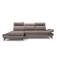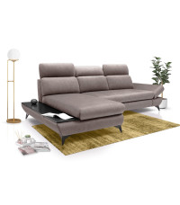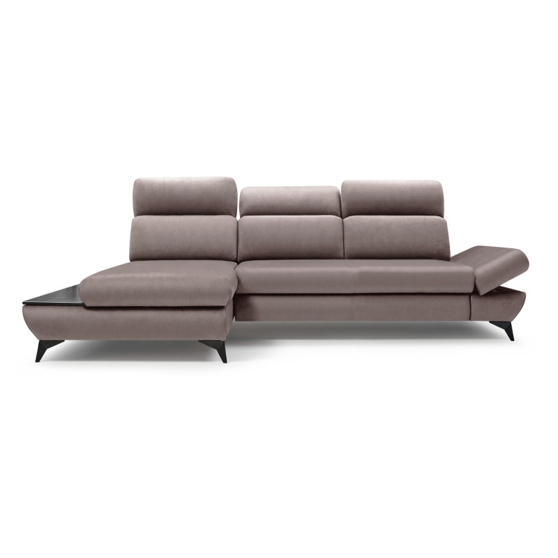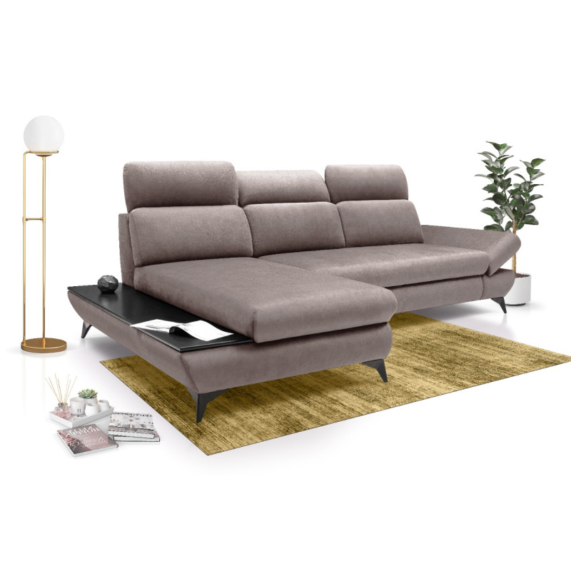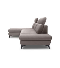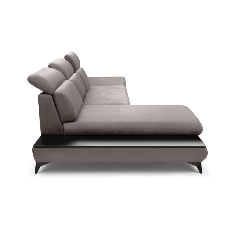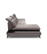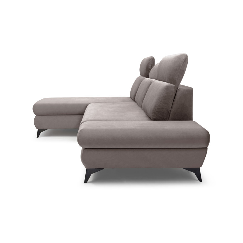 Narożnik Titan Fancy 90 w wersji lewej w chłodnym, brązowym odcieniu łączy nowoczesny design z funkcjonalnością. Regulowane zagłówki i podłokietniki zwiększają komfort użytkowania.