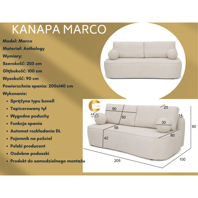 Kanapa Marco jest idealnym połączeniem elegancji i komfortu. Nowoczesny design nada charakteru Twojemu wnętrzu, a szeroka i wygodna powierzchnia spania pozwoli na zasłużony odpoczynek.