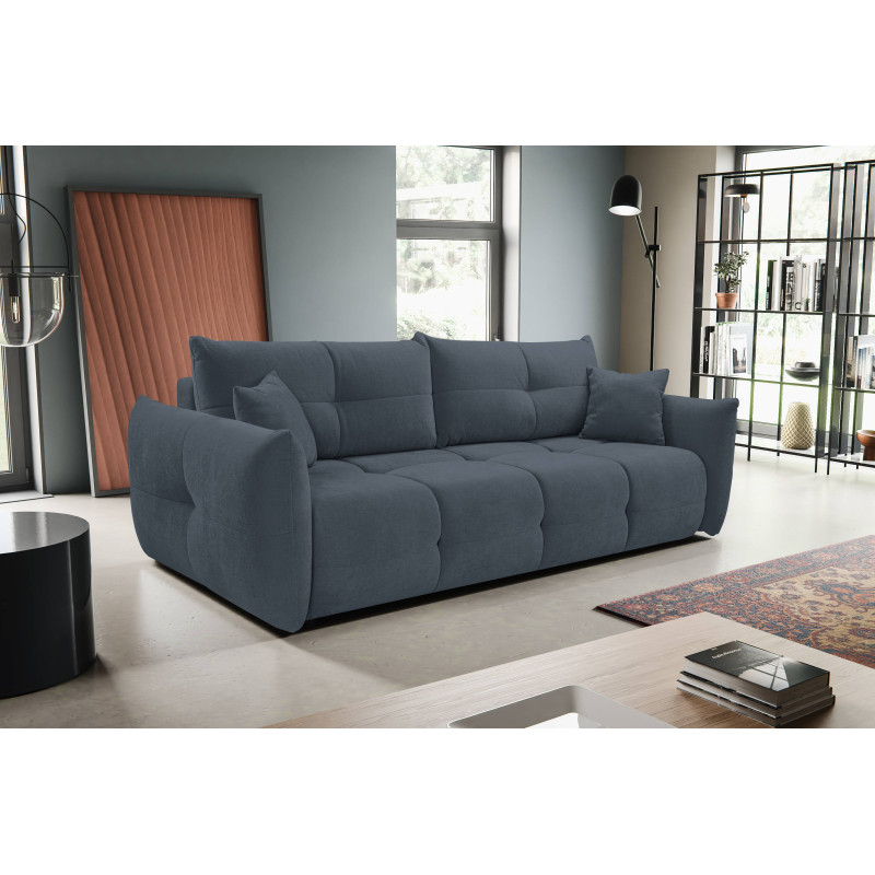 Sofa BASE WIND 76 w eleganckim, ciemnoniebieskim odcieniu łączy komfort, styl i funkcjonalność. Dzięki funkcji spania DL i pojemnikowi na pościel to idealne rozwiązanie do salonu i pokoju gościnnego.