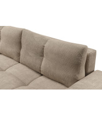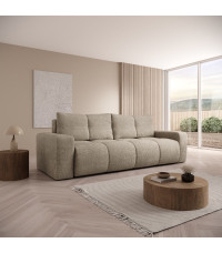 SOHO sofa FLOW 01 to wygodna sofa w eleganckim, beżowym odcieniu tkaniny Flow. Mebel posiada funkcję spania typu DL oraz pojemnik na pościel. Nowoczesny design i luźne poduchy oparciowe zapewniają komfort i styl.