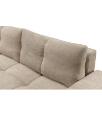 Sofa SOHO FLOW 02 ma wymiary 259 x 90 x 99 cm, a wysokość siedziska wynosi 44 cm, co gwarantuje wygodne użytkowanie na co dzień. Mebel wyposażono w funkcję spania typu DL, a powierzchnia po rozłożeniu to aż 149 x 200 cm – idealna na okazjonalny nocleg. Wbudowany pojemnik na pościel zwiększa jej funkcjonalność, pomagając w utrzymaniu porządku. Tapicerowana została miękką tkaniną FLOW 02 w delikatnym, jasnobeżowym kolorze o lekko ziarnistej strukturze, który doskonale ociepla wnętrze. Luźne poduchy oparciowe nadają całości miękkości i nowoczesnego wyglądu. Sofa będzie świetnie komponować się z jasną lub neutralną aranżacją, wprowadzając do salonu harmonię i elegancję. Czarne, niskie nóżki (2 cm) są dyskretne, a sam mebel wymaga prostego montażu po dostawie.