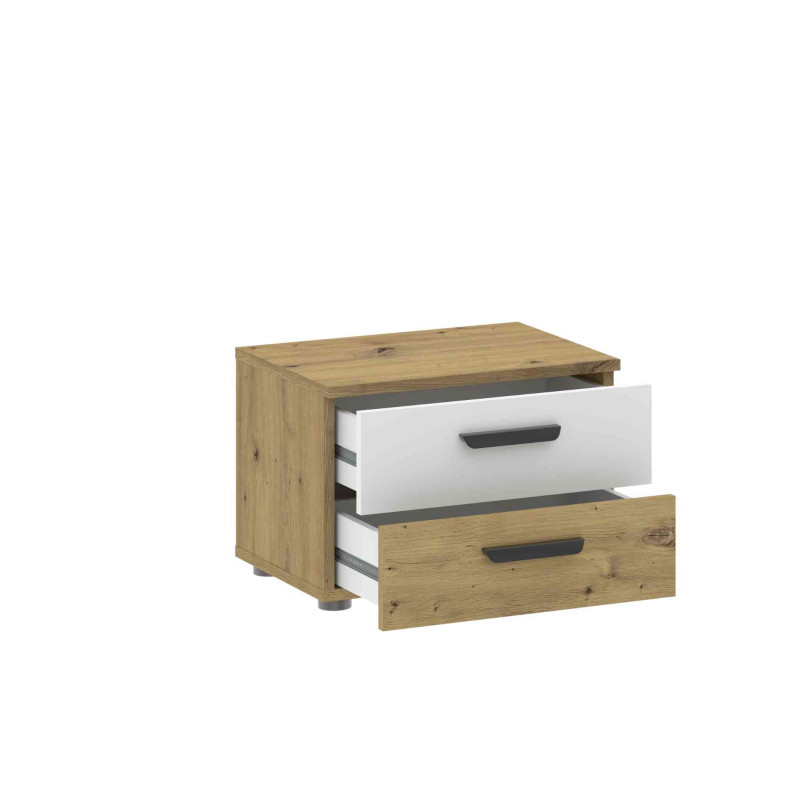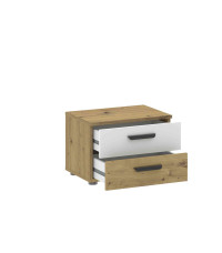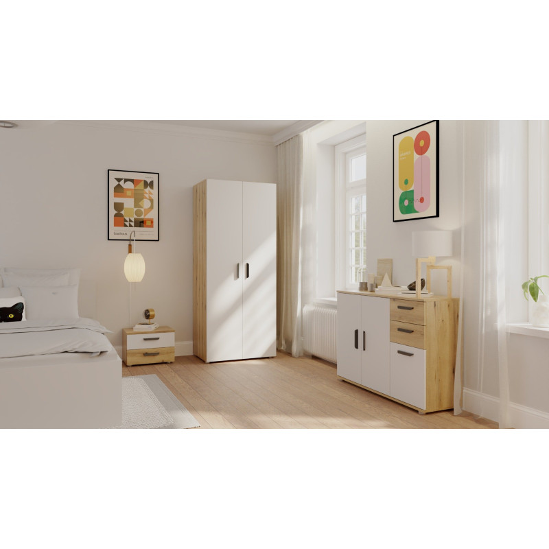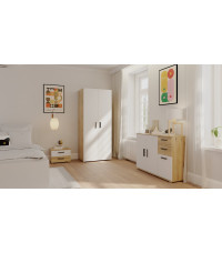 Kolekcja mebli Basic Two, doskonale pasująca do każdej sypialni, harmonijnie łączy dwa eleganckie dekory. Korpusy mebli mają wykończenie w kolorze dębu Artisan, a fronty wykonane są w klasycznym białym odcieniu.