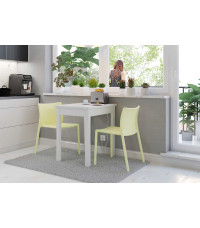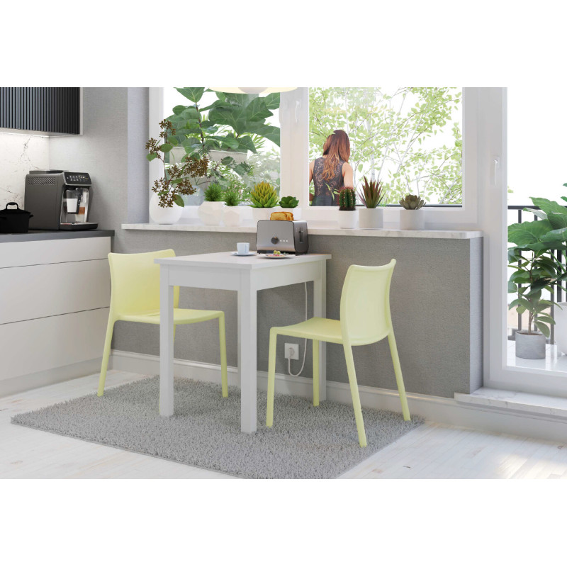 Kompaktowy i stylowy stół wykonany z białej płyty laminowanej o grubości 18 mm. Blat zabezpieczony trwałym obrzeżem ABS 0,4 mm, pozostałe krawędzie wykończone obrzeżem papierowym w kolorze mebla. Stabilne nogi z MDF (50x50 mm) z praktycznymi ślizgaczami chroniącymi podłogę. Dzięki wymiarom 750 × 763 × 550 mm idealnie sprawdzi się w mniejszych wnętrzach – kuchni, aneksie czy domowym biurze.
