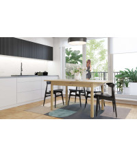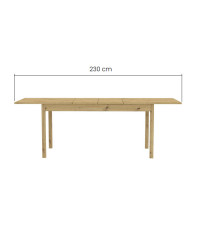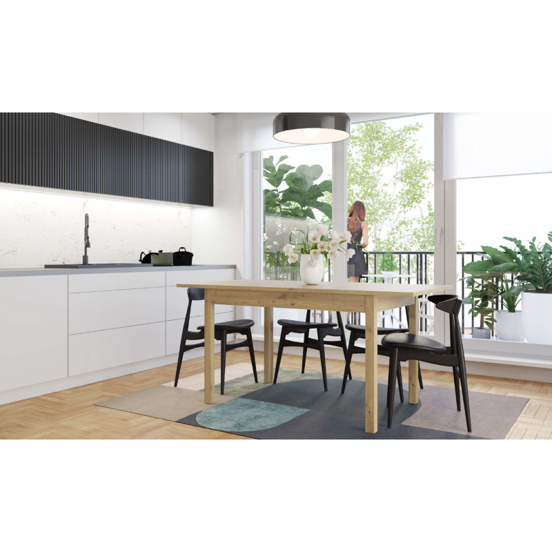 Stylowy, rozkładany stół w ciepłym dekorze dąb artisan, który łączy naturalny wygląd drewna z nowoczesną funkcjonalnością. Wykonany z trwałej płyty laminowanej o grubości 18 mm, z blatem i wkładkami zabezpieczonymi wytrzymałym obrzeżem ABS 0,4 mm, co zapewnia odporność na codzienne użytkowanie. Pozostałe krawędzie wykończono papierowym obrzeżem dopasowanym kolorystycznie do bryły mebla. Solidne nogi z MDF o profilu 50x50 mm gwarantują stabilność, a ślizgacze chronią podłogę i ułatwiają przesuwanie. Stół wyposażono również w prowadnicę H37 o długości 600 mm oraz dwie wkładki, które pozwalają na łatwe rozłożenie i dostosowanie długości do potrzeb – idealny zarówno do rodzinnych posiłków, jak i codziennego użytkowania.