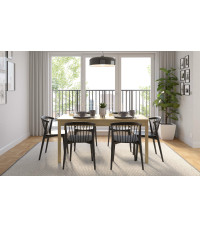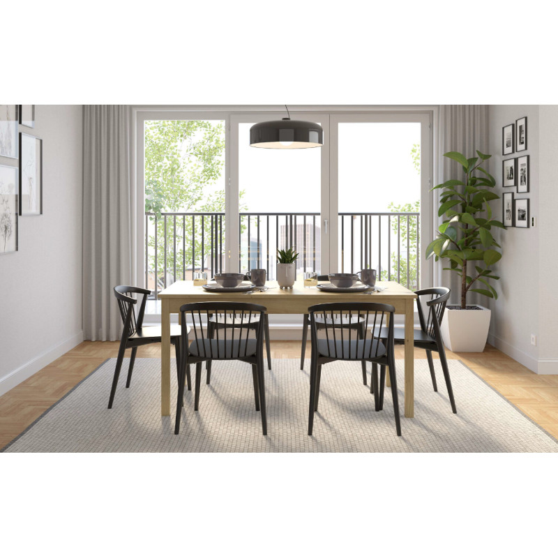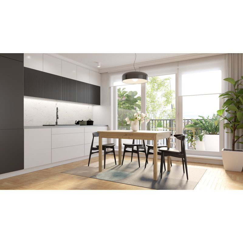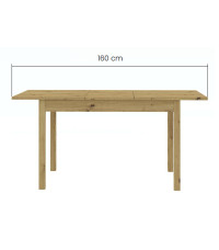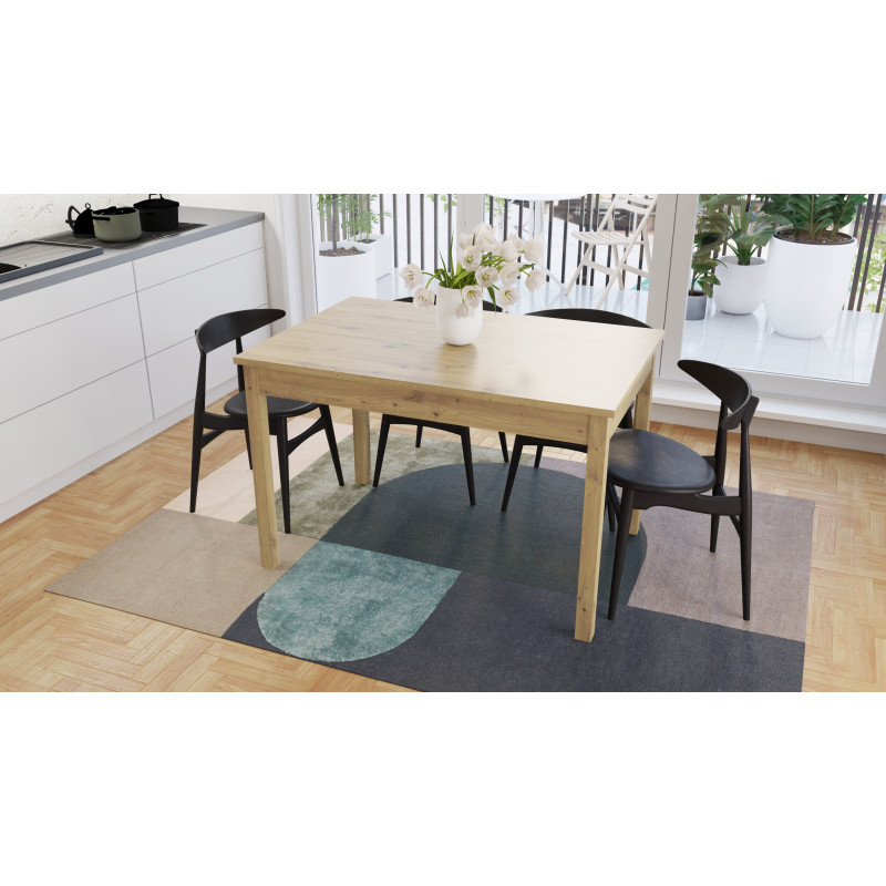 Kompaktowy i stylowy stół w dekorze dąb artisan, idealny do nowoczesnych i przytulnych wnętrz. Wykonany z trwałej płyty laminowanej o grubości 18 mm, z blatem i wkładką zabezpieczonymi odpornym obrzeżem ABS 0,4 mm. Pozostałe krawędzie wykończone są papierowym obrzeżem dopasowanym do koloru bryły. Stół opiera się na solidnych nogach z MDF o profilu 50x50 mm, które zapewniają stabilność i elegancki wygląd. Ślizgacze chronią podłogę i ułatwiają przesuwanie. Model wyposażony jest w prowadnicę H37 o długości 600 mm oraz jedną wkładkę, dzięki czemu z łatwością zwiększysz powierzchnię blatu wtedy, gdy tego potrzebujesz – idealny na co dzień i przy okazji spotkań w mniejszym gronie.