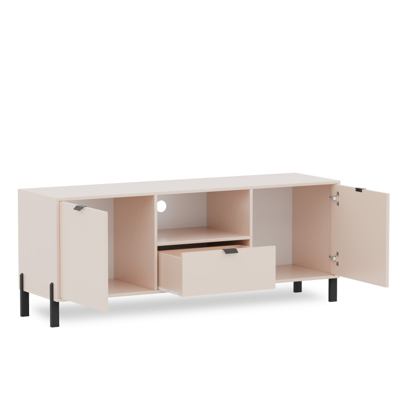 Szafka RTV Cremona to idealne rozwiązanie dla osób szukających połączenia stylu i funkcjonalności. Wykonana z wysokiej jakości materiałów, w kolorze beż piaskowy, pasuje do różnych aranżacji wnętrz. Posiada przestronną półkę na sprzęt multimedialny oraz dodatkowe miejsce do przechowywania drobnych przedmiotów. Metalowe nóżki w kolorze czarnym dodają lekkości i nowoczesnego charakteru.
