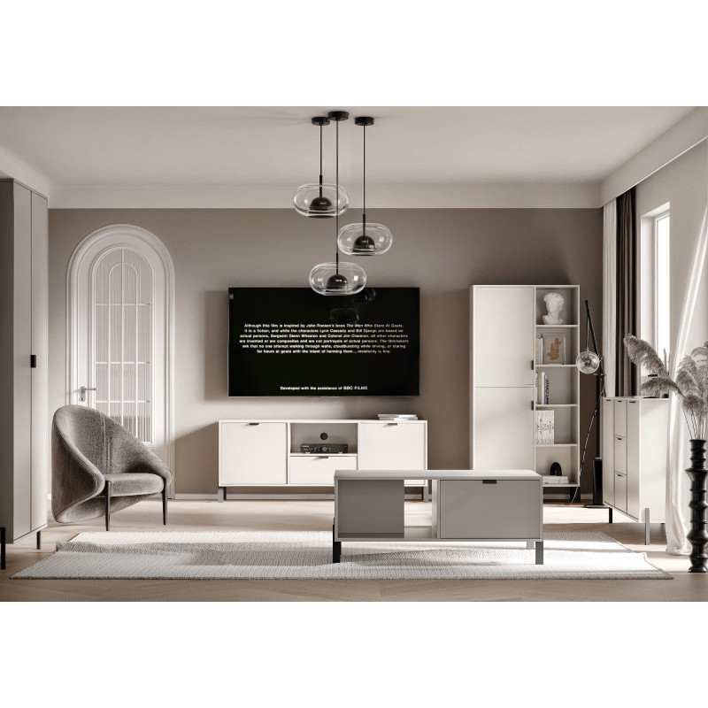 Szafka RTV Cremona to połączenie funkcjonalności i naturalnej elegancji. Jej długość 161 cm, wysokość 62 cm i głębokość 45 cm zapewniają odpowiednią przestrzeń na sprzęt multimedialny, a jednocześnie nie zajmują dużo miejsca w pokoju. Wyposażona w dwie szafki z drzwiami oraz otwarte półki, umożliwia uporządkowanie pilotów, konsoli i innych akcesoriów. Fronty z płyty MDF z delikatnym ryflowaniem i wykończeniem ABS dodają meblowi subtelnej faktury i trwałości. Beżowy kolor wprowadza ciepło i spójność do wnętrza. Ta szafka sprawdzi się zarówno w salonie, jak i w pokoju młodzieżowym.