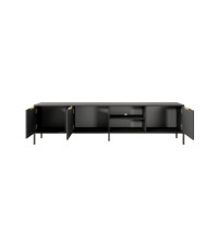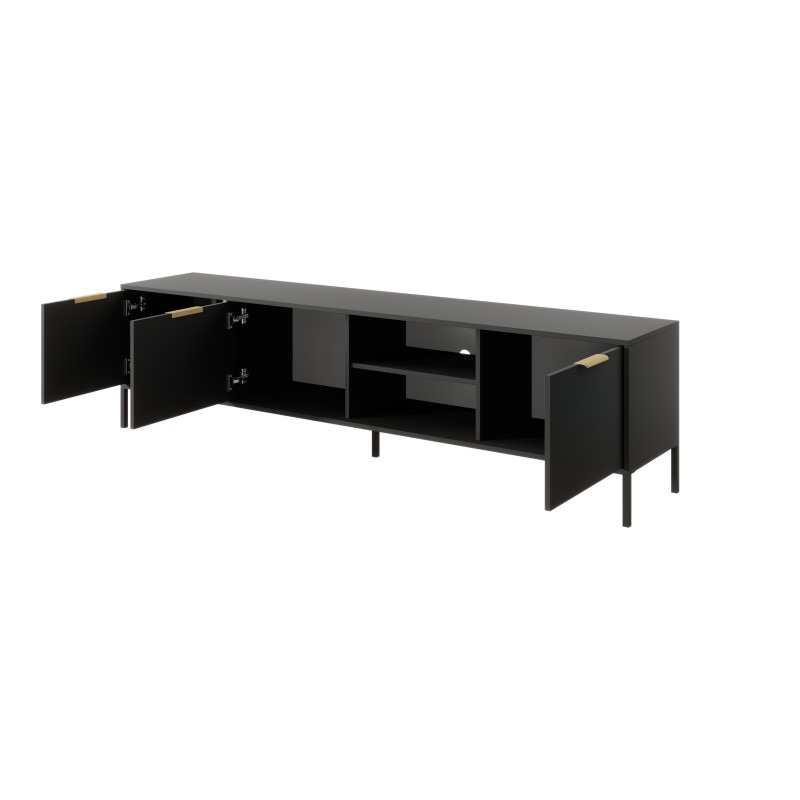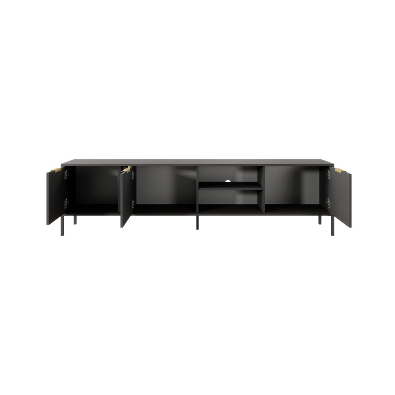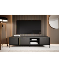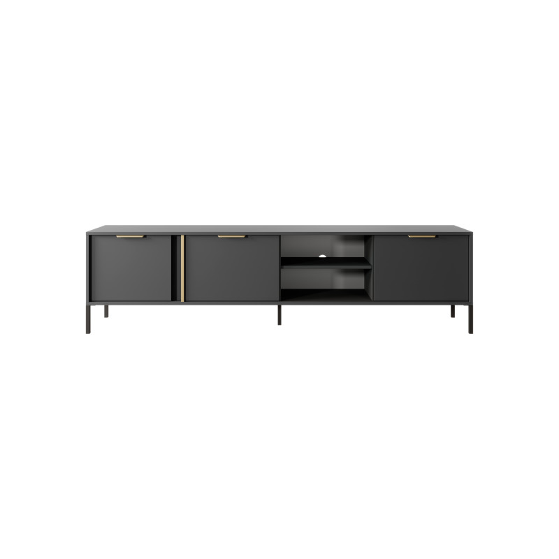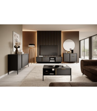Stolik RTV F to stylowy i praktyczny mebel w antracytowym odcieniu z eleganckimi złotymi detalami, który doskonale wpisze się w nowoczesną strefę dzienną. Szeroka powierzchnia zapewnia miejsce na sprzęt RTV oraz dekoracje. Minimalistyczny design łączy funkcjonalność z wyrafinowanym wyglądem.