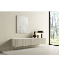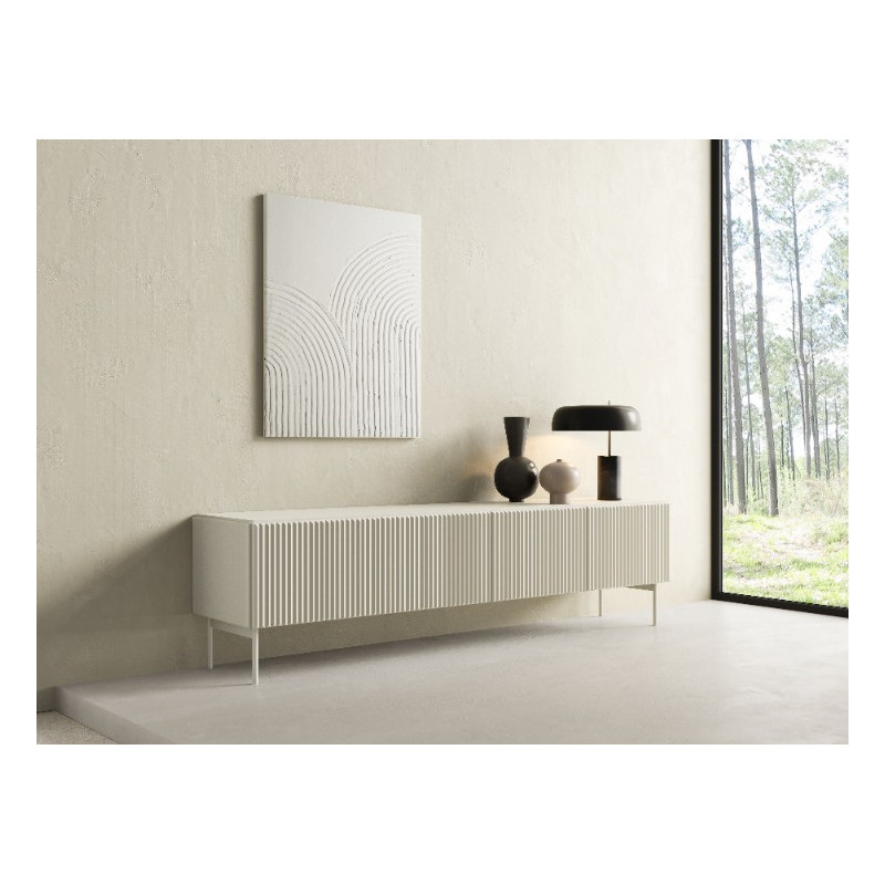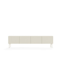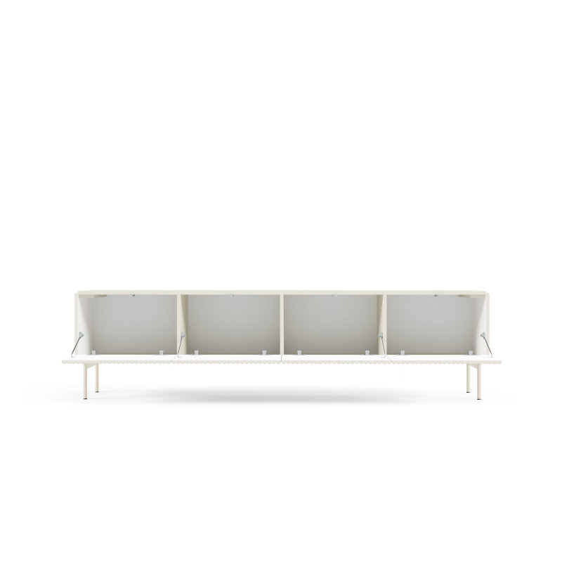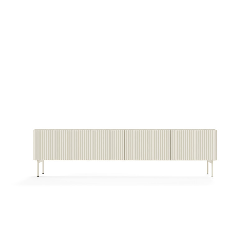 Stolik RTV 195 4D z kolekcji MUTI w kolorze kaszmir to połączenie elegancji z funkcjonalnością, idealne do nowoczesnego salonu. Mebel ma wymiary 195,2 cm szerokości, 51,2 cm wysokości oraz 39,8 cm głębokości, zapewniając dużo przestrzeni do przechowywania sprzętu multimedialnego i innych przedmiotów. Wykonany jest z ryflowanej płyty MDF oraz laminowanej płyty wiórowej, co gwarantuje trwałość i wytrzymałość. Metalowe nogi w kolorze kaszmir dodają lekkości i nowoczesnego charakteru. Fronty bez uchwytów wyposażone w system push-to-open podkreślają minimalistyczny styl i ułatwiają użytkowanie. Jasny, delikatny odcień kaszmir doskonale komponuje się z różnymi aranżacjami wnętrz, szczególnie z jasnymi i naturalnymi przestrzeniami. Ten stolik RTV to doskonałe rozwiązanie dla osób, które cenią sobie estetykę i porządek w codziennym użytkowaniu.