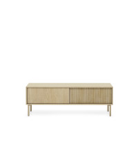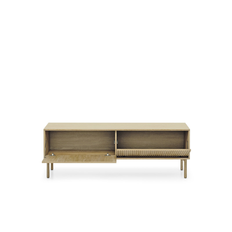 Stolik RTV 153 2d z serii Tavo wykonany jest z laminowanej płyty wiórowej w kolorze dąb cremona, co gwarantuje trwałość i łatwość w utrzymaniu czystości. Fronty mebla to ryflowana płyta MDF oraz płyta wiórowa w tym samym odcieniu, uzupełnione elementami HDF w kolorze dąb sonoma, które dodają mu naturalnego charakteru. Mebel ma wymiary 153,5 cm szerokości, 51,8 cm wysokości oraz 39,5 cm głębokości, zapewniając dużo miejsca na sprzęt RTV i akcesoria. System push-to-open ułatwia dostęp do schowków, a brak uchwytów podkreśla minimalistyczny, nowoczesny styl. Solidne drewniane nogi dodają stabilności oraz elegancji. Prowadnice kulkowe z pełnym wysuwem sprawiają, że otwieranie szuflad jest płynne i ciche. Stolik RTV świetnie sprawdzi się w salonie urządzonym w jasnym, naturalnym stylu, gdzie ceni się funkcjonalność i design.