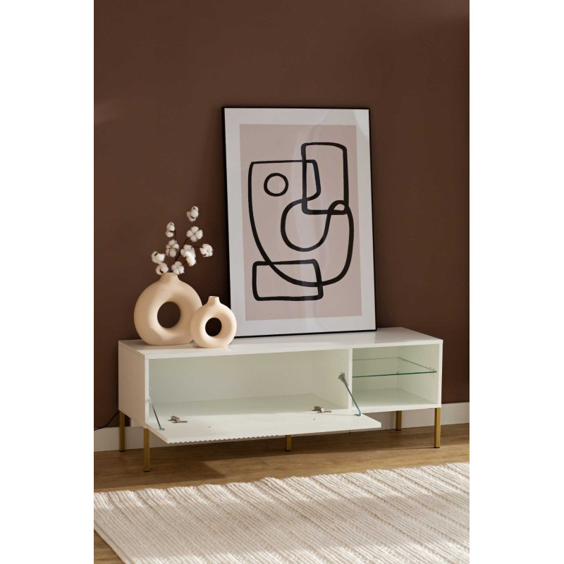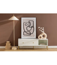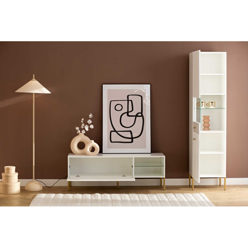 Cechą wyróżniającą kolekcji Oxo jest piękny, ryflowany front, który dodaje charakteru oraz oferuje atrakcyjną alternatywę do tradycyjnych, gładkich powierzchni. Złote, proste, metalowe nóżki nadają meblowi lekkość i elegancję, a także ułatwiają czyszczenie podłogi pod meblem. Uchwyty są okrągłe i gładkie, co umożliwia łatwe otwieranie, nie zostawiając przy tym żadnych zabrudzeń ani śladów na estetycznym froncie.