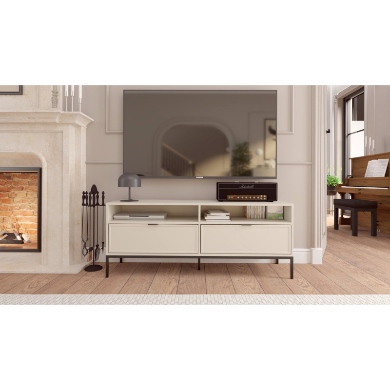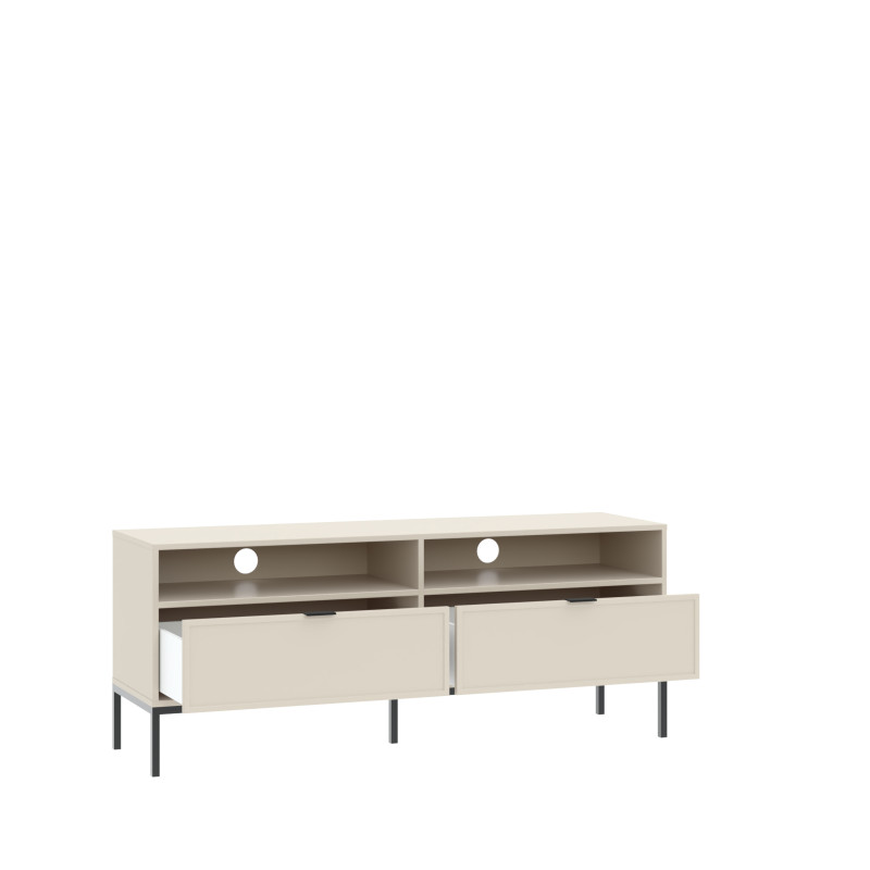Szafka RTV DECO 2S w kolorze kaszmir to stylowa baza pod domowe centrum rozrywki. Eleganckie fronty z ramką, czarne detale i praktyczne szuflady tworzą spójną całość. Idealna do salonów, w których liczy się zarówno design, jak i porządek.