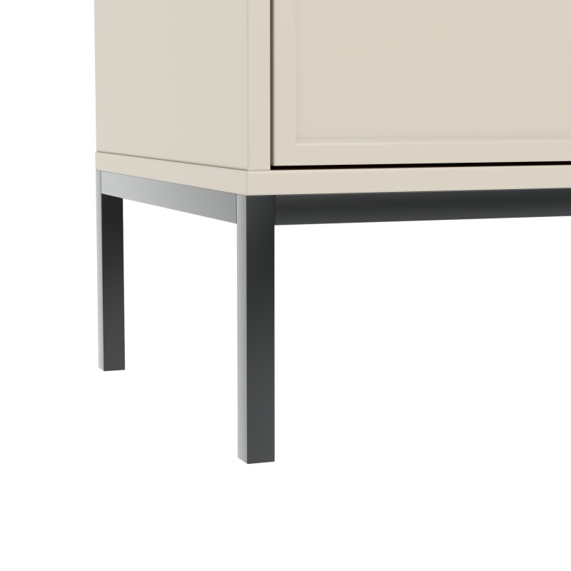Szafka RTV DECO 2S RAMKA to nowoczesna propozycja dla osób, które cenią subtelną elegancję i funkcjonalność w jednym. Mebel o wymiarach 150 cm długości, 40 cm głębokości i 60 cm wysokości zapewnia komfortowe miejsce pod telewizor oraz miejsce do przechowywania dzięki dwóm pojemnym szufladom. Fronty wykonane z MDF-u o grubości 16 mm zostały ozdobione dekoracyjną ramką, która w połączeniu z nakładanymi czarnymi uchwytami tworzy elegancki, nowoczesny look. Korpus w kolorze kaszmir wykonany z laminowanej płyty prezentuje się niezwykle subtelnie, a biały frezowany tył z HDF montowany we wręgę podkreśla dbałość o detale. Szuflady z białym wnętrzem osadzone są na prowadnicach z dolnym montażem i dociągiem, co zapewnia płynne, ciche użytkowanie. Całość wsparta jest na czarnym, metalowym stelażu o profilu 20x20 mm, który nadaje konstrukcji lekkości i nowoczesnego charakteru. Szafka DECO świetnie odnajdzie się w eleganckim salonie lub pokoju dziennym, oferując stylową i praktyczną przestrzeń dla sprzętu RTV i dodatków.