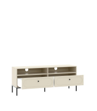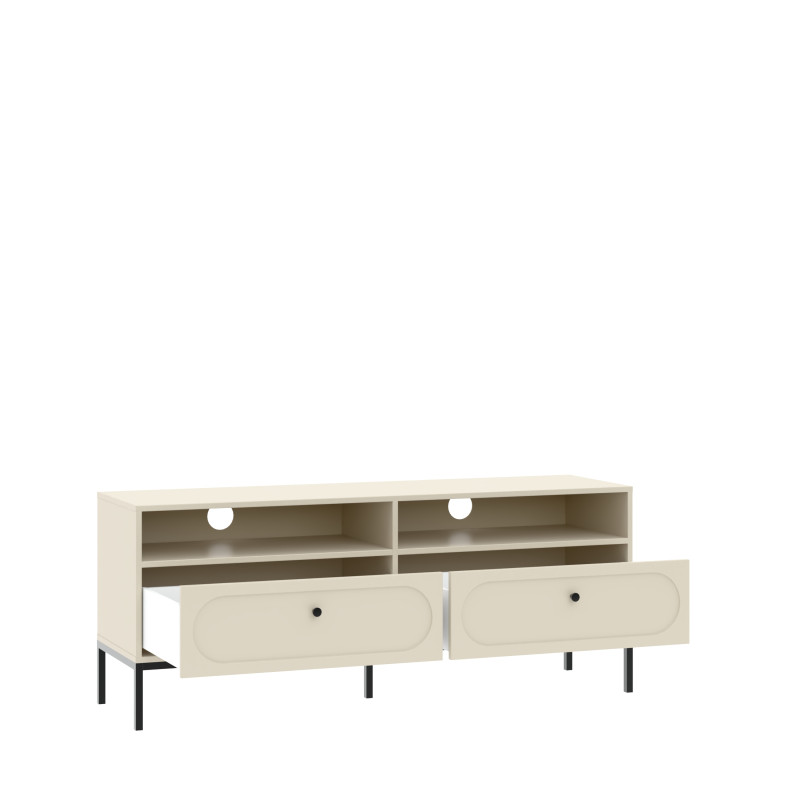 Szafka RTV MUNA 2S w kolorze kaszmir z czarnymi detalami to stylowe tło dla Twojej strefy multimedialnej. Zaokrąglone frezy typu „jajko” i czarne uchwyty w formie gałek wprowadzają subtelny retro vibe. Idealna do nowoczesnego salonu z nutą elegancji.