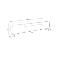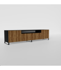 Szafka jest stojąca, stabilna i solidna. Oferuje praktyczną przestrzeń na sprzęt RTV, zamykaną szafkę pośrodku, otwartą półkę oraz boczne schowki, które pomagają utrzymać porządek i estetykę w salonie. System push to open zapewnia wygodę użytkowania i minimalistyczny wygląd bez uchwytów.