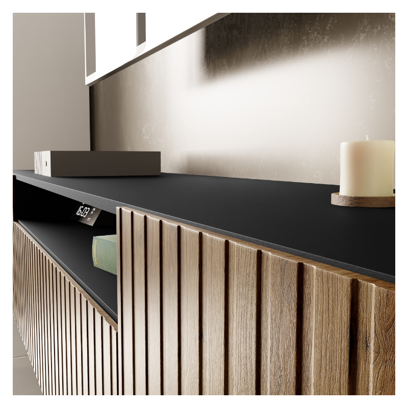Szafka RTV MIO to stylowe i funkcjonalne rozwiązanie pod telewizor, które doskonale odnajdzie się zarówno w nowoczesnych, jak i klasycznych wnętrzach. Wykonana z wysokiej jakości laminowanej płyty, wyróżnia się eleganckim frontem w kolorze dębu catania – frezowanym i foliowanym – który w połączeniu z czarnym korpusem nadaje meblowi wyjątkowy, przytulny charakter. Piękne wykonanie oraz dbałość o detale podkreślają estetykę całej bryły.
