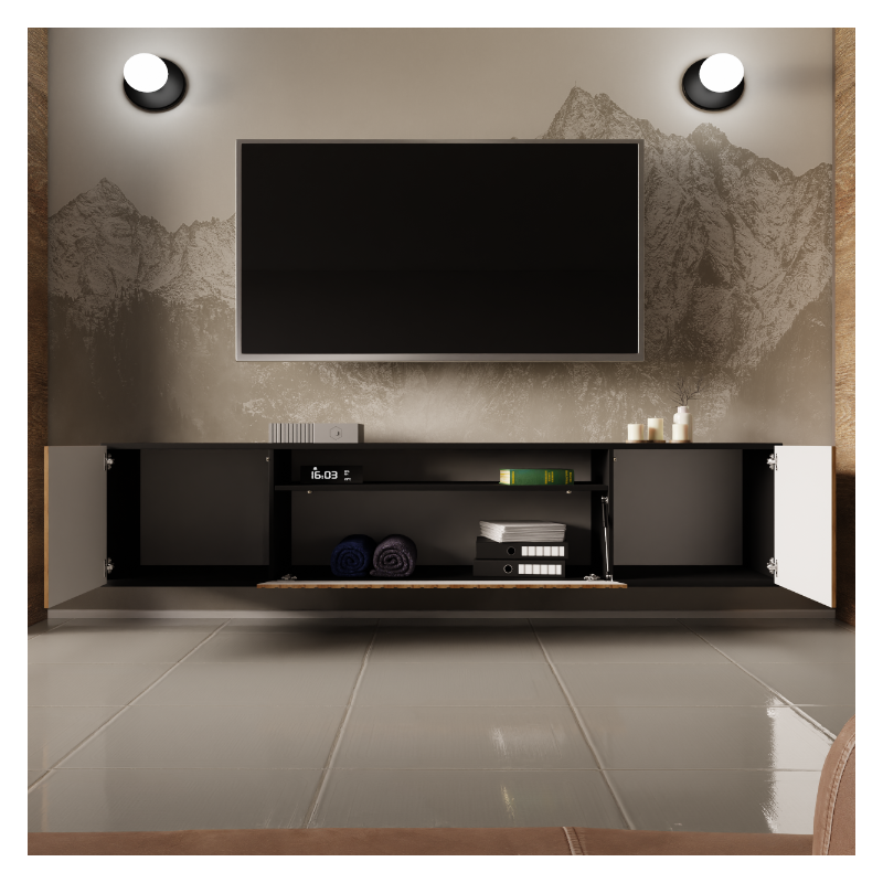 Nowoczesna, wisząca szafka RTV MIO w kolorze czarnym z frontem dąb catania to eleganckie i funkcjonalne rozwiązanie, które nadaje wnętrzu lekkości i podkreśla nowoczesny charakter salonu.