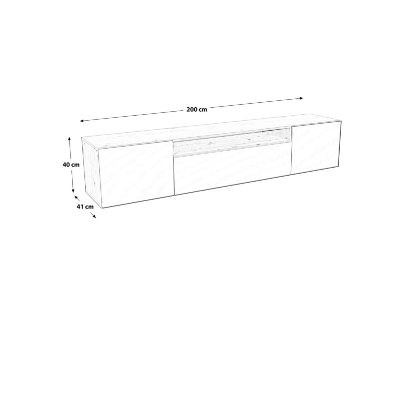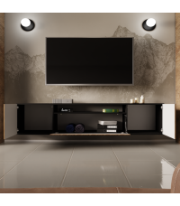 Wisząca forma szafki nadaje wnętrzu lekkości i nowoczesności, a jednocześnie ułatwia utrzymanie czystości pod meblem. Funkcjonalne wnętrze zapewnia miejsce na sprzęt RTV, zamykaną szafkę pośrodku, otwartą półkę oraz boczne schowki. System push to open gwarantuje komfort użytkowania oraz estetyczny wygląd bez uchwytów.