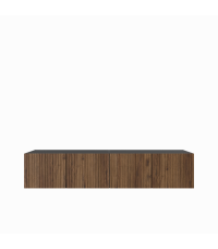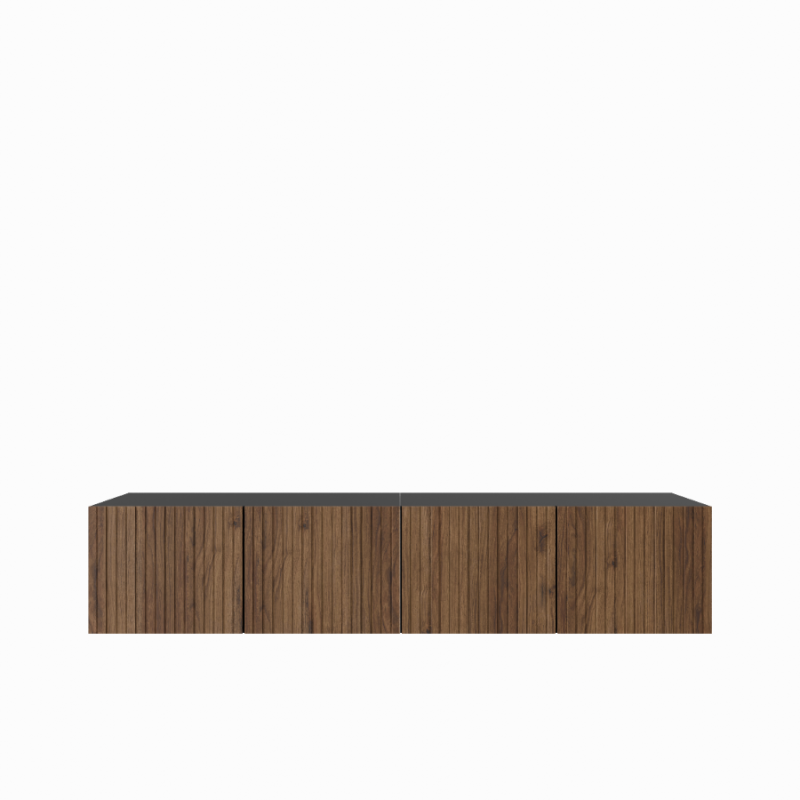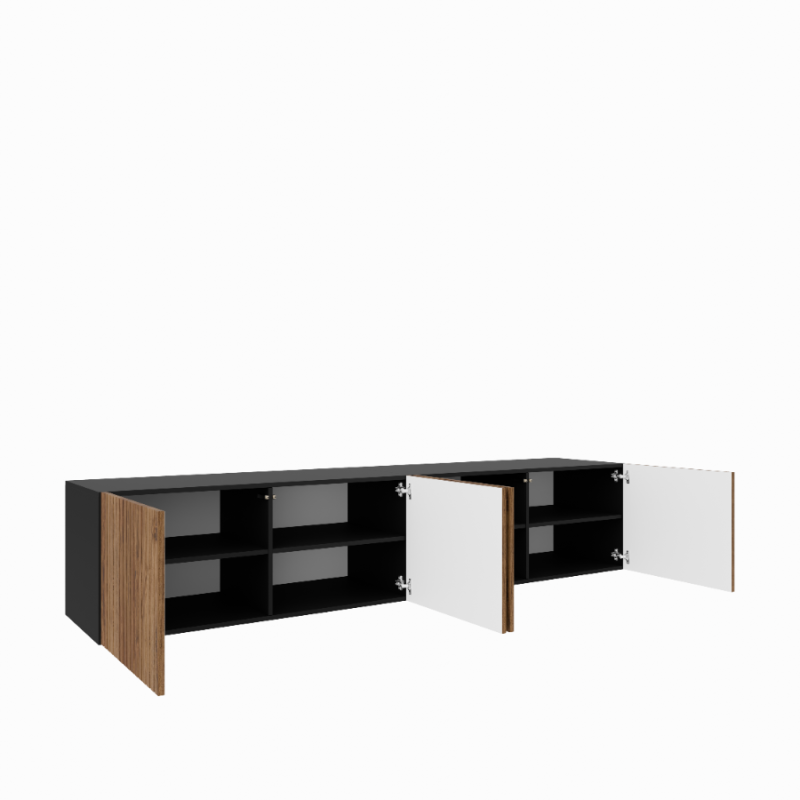Wisząca konstrukcja nadaje wnętrzu lekkości i nowoczesnego wyglądu, jednocześnie zapewniając wygodną przestrzeń do przechowywania sprzętu RTV i akcesoriów. System push to open gwarantuje komfort użytkowania oraz minimalistyczną formę bez uchwytów.