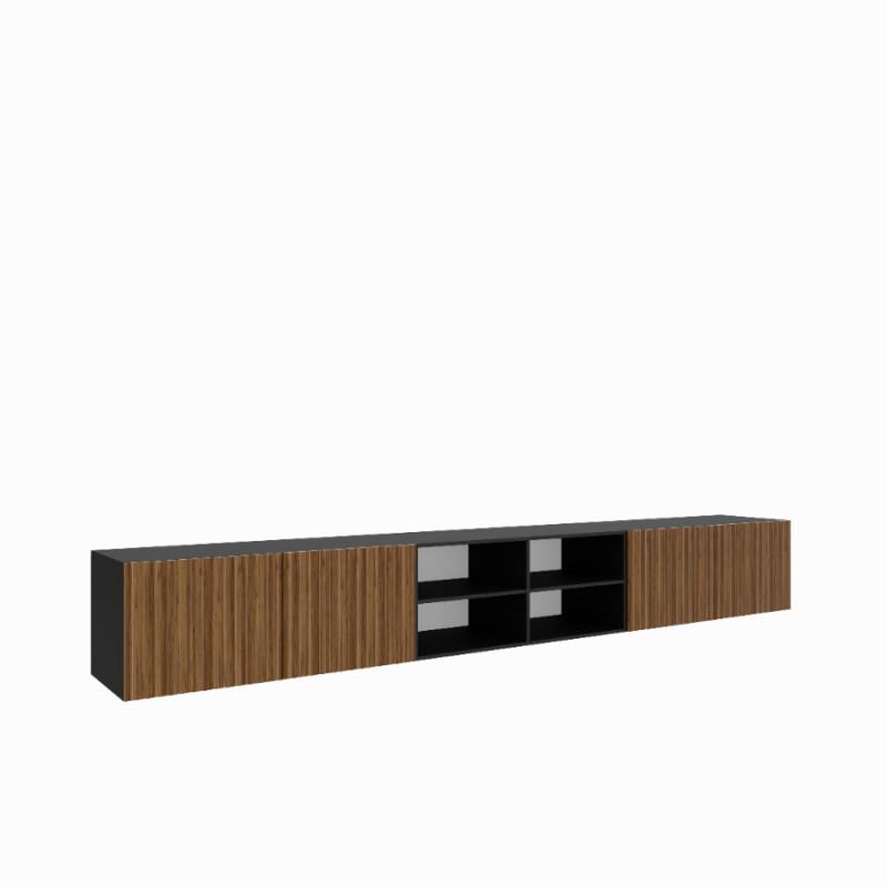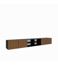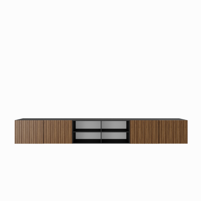 Centralna część szafki została wyposażona w otwarte półki, idealne na sprzęt RTV, konsole lub dekoracje. Po bokach znajdują się zamykane segmenty z drzwiczkami, które zapewniają wygodną przestrzeń do przechowywania. System push to open gwarantuje komfort użytkowania i estetyczny wygląd bez uchwytów. Wisząca forma dodaje wnętrzu lekkości i nowoczesnej elegancji.