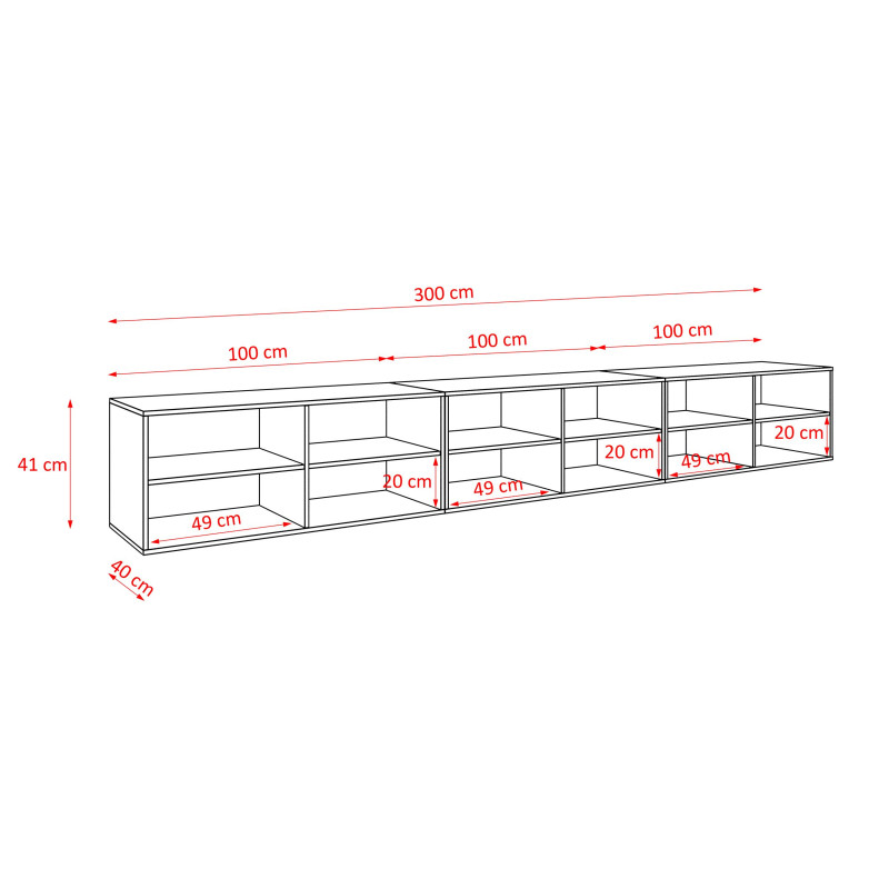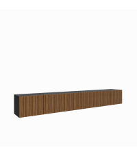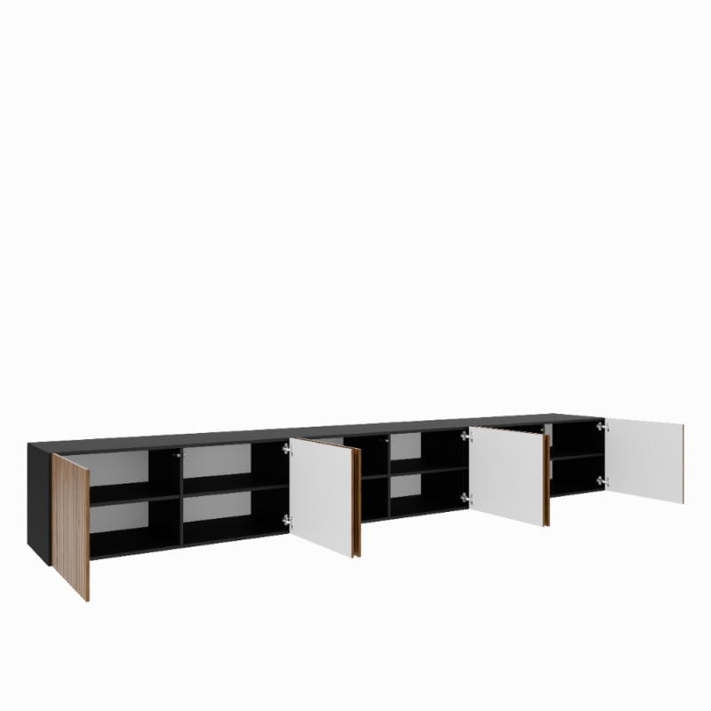 Wisząca szafka RTV MIO 3x100 zamknięta w kolorze czarnym z frontami dąb catania to elegancka, nowoczesna zabudowa z sześcioma drzwiczkami i funkcjonalnym wnętrzem do przechowywania.