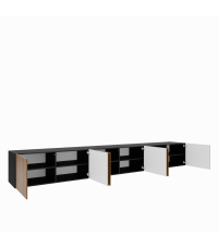 Szafka została wyposażona w sześć drzwiczek oraz praktyczne półki wewnętrzne, które umożliwiają wygodne przechowywanie sprzętu RTV, akcesoriów i innych domowych przedmiotów. System push to open zapewnia wygodę użytkowania oraz minimalistyczny wygląd bez uchwytów. Wisząca konstrukcja sprawia, że mebel prezentuje się lekko i nowocześnie.