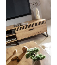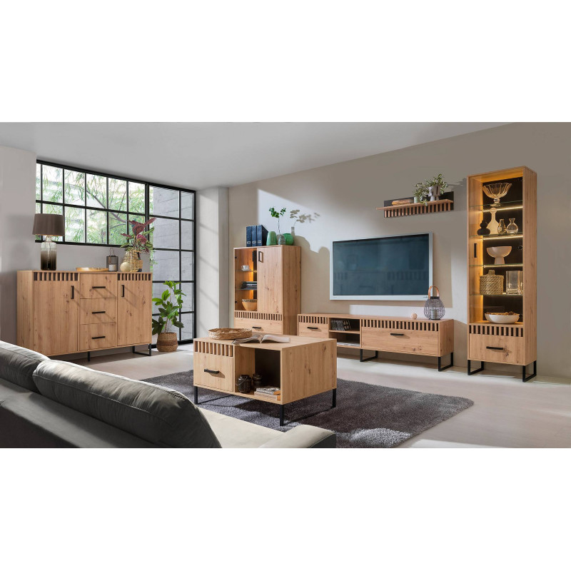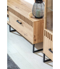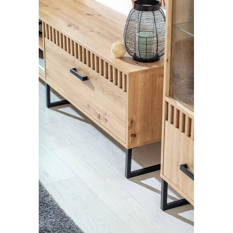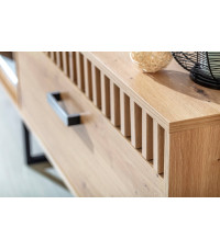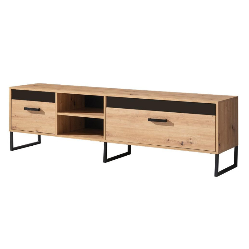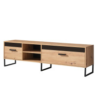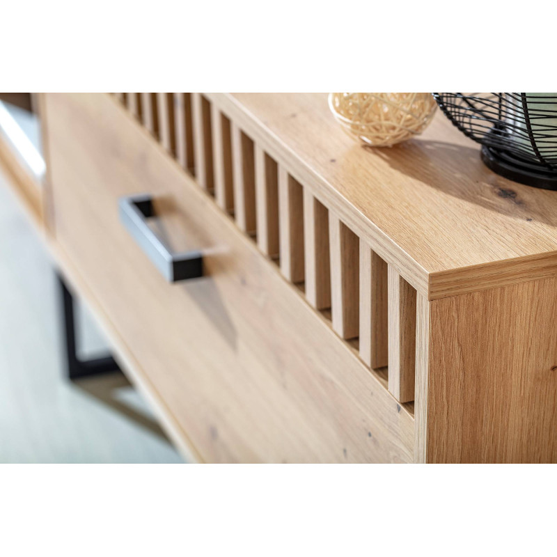 Szafka RTV LAMELIX 07 to stylowy i funkcjonalny mebel, idealny do nowoczesnych salonów i pokojów dziennych. Model z kolekcji LAMELIX marki Domel łączy prosty, ale efektowny design z loftowym, industrialnym charakterem, oferując jednocześnie dużą funkcjonalność. Jej wymiary – 180 cm szerokości, 52 cm wysokości i 40 cm głębokości – zapewniają przestronność niezbędną do przechowywania sprzętu multimedialnego, jednocześnie nie przytłaczając wnętrza. Szafka wyposażona jest w dwie pojemne szuflady, które umożliwiają wygodne przechowywanie drobnych akcesoriów, oraz dwie przestronne wnęki, idealne na sprzęt RTV, konsole do gier, dekodery i inne urządzenia. Wykonana z wysokiej jakości laminowanej płyty wiórowej, szafka jest odporna na wilgoć, zarysowania i zabrudzenia, co gwarantuje jej trwałość oraz łatwość w utrzymaniu. Odcień dąb artisan w połączeniu z matowymi frontami dodaje meblowi ciepła i elegancji, a metalowe uchwyty i nogi podkreślają nowoczesny, loftowy styl, nadając całości surowy, ale stylowy wygląd. Szafka RTV LAMELIX 07 to doskonałe rozwiązanie do organizacji sprzętu RTV, które jednocześnie stanowi estetyczny element wystroju wnętrza. To praktyczny i stylowy mebel, który idealnie wpasuje się w nowoczesne aranżacje.