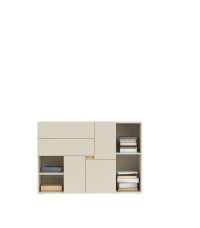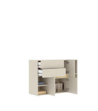 Szafka LENS 3D2S w kolorze kaszmir to stylowy i praktyczny mebel o spokojnym, ciepłym odcieniu. Ozdobna listwa w kolorze Dąb Cremona subtelnie przełamuje jednolitą bryłę, dodając całości elegancji. To świetny wybór dla miłośników nowoczesnych, ale przytulnych wnętrz.