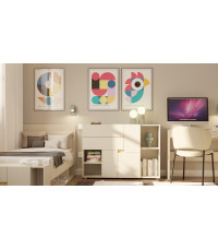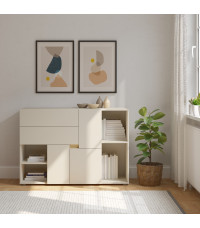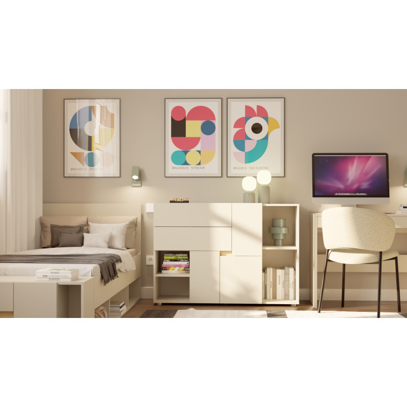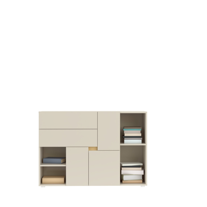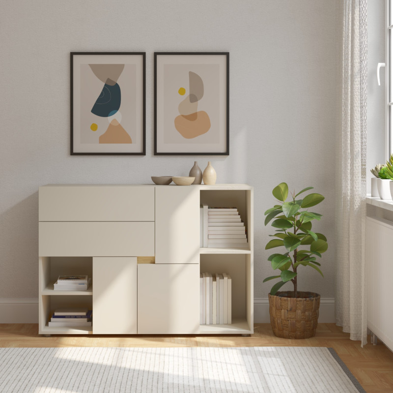 Szafka LENS 3D2S w kolorze kaszmir to uniwersalny mebel o długości 120 cm, głębokości 41,6 cm i wysokości 85 cm, który odnajdzie się zarówno w salonie, sypialni, jak i w przestrzeni biurowej. Korpus i fronty zostały wykonane z odpornej na codzienne użytkowanie płyty wiórowej laminowanej o grubości 16 mm, a jej gładkie wykończenie w subtelnym odcieniu kaszmiru dodaje wnętrzu ciepła i klasy. Brak uchwytów i system otwierania poprzez delikatny otwór między frontami podkreślają minimalistyczny charakter mebla. Poza trzema drzwiami, za którymi kryją się dwie półki, szafka oferuje również dwie pojemne szuflady na kulkowych prowadnicach, idealne na dokumenty, tekstylia czy drobiazgi. Charakterystyczna listwa w dekorze Dąb Cremona umieszczona pomiędzy frontami wnosi do projektu naturalny akcent, który świetnie współgra z nowoczesnymi trendami. Całość spoczywa na niewielkich, srebrnych nóżkach z tworzywa, które zapewniają stabilność i delikatnie unoszą bryłę. Szafka LENS łączy w sobie funkcjonalność, prostotę i dekoracyjną finezję, dlatego świetnie sprawdzi się w wielu stylach aranżacyjnych – od skandynawskich po loftowe.