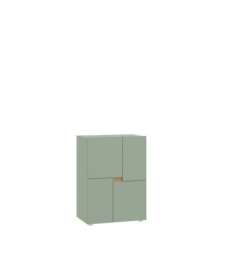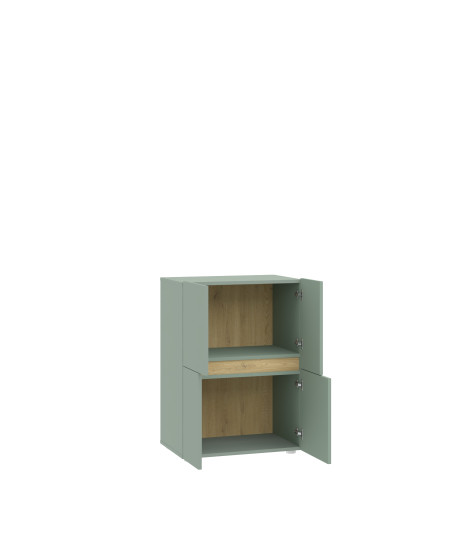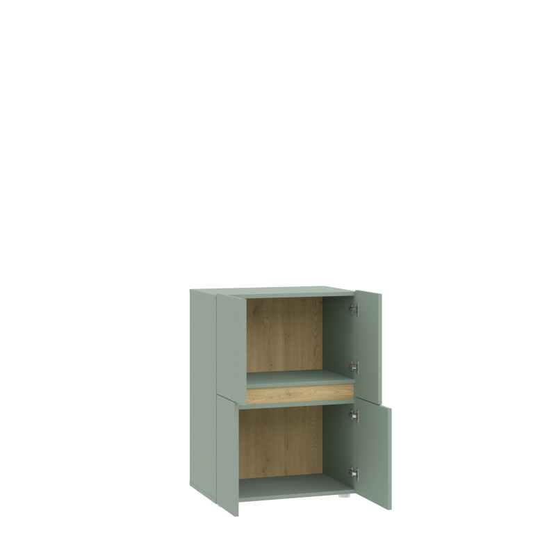 Szafka LENS 4D 60 w kolorze aloes to idealne połączenie funkcjonalności i współczesnego stylu. Jej kompaktowe wymiary – 60 cm długości, 41,6 cm głębokości oraz 85 cm wysokości – sprawiają, że doskonale odnajdzie się w mniejszych przestrzeniach: od przedpokoju, przez sypialnię, aż po biuro. Korpus i fronty zostały wykonane z trwałej płyty laminowanej o grubości 16 mm, a ich powierzchnia w odcieniu świeżej zieleni dodaje wnętrzu lekkości i oryginalności. Ozdobna listwa w kolorze Dąb Cremona przełamuje jednolitą bryłę, wprowadzając nutę przytulności i naturalnego kontrastu. Szafka nie posiada uchwytów – została zaprojektowana z praktycznym wcięciem między frontami, które pozwala na łatwe otwieranie. Za czterema frontami znajduje się jedna półka, dzięki której przestrzeń wewnętrzna staje się bardziej uporządkowana. Całość dopełniają srebrne, okrągłe stopki z tworzywa, które nadają meblowi lekkości. To idealny wybór do nowoczesnych, kreatywnych wnętrz z zielonym twistem.