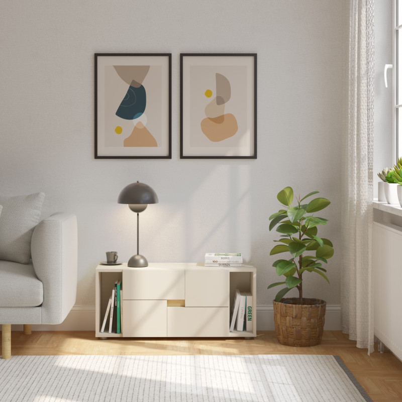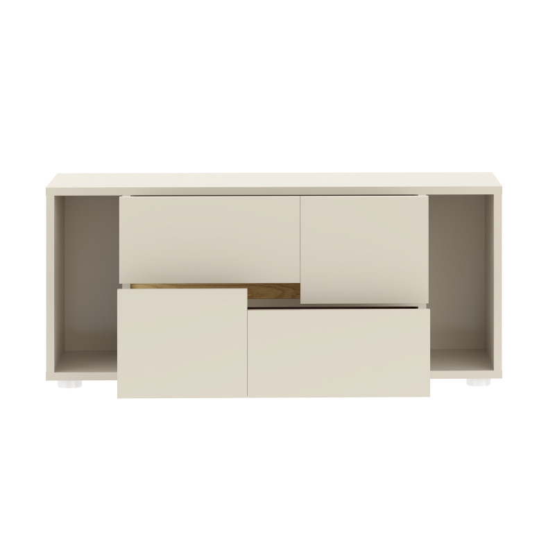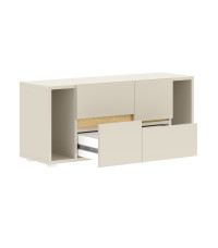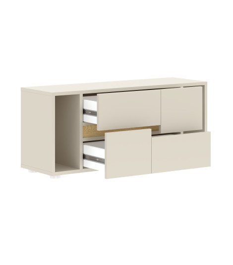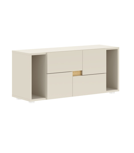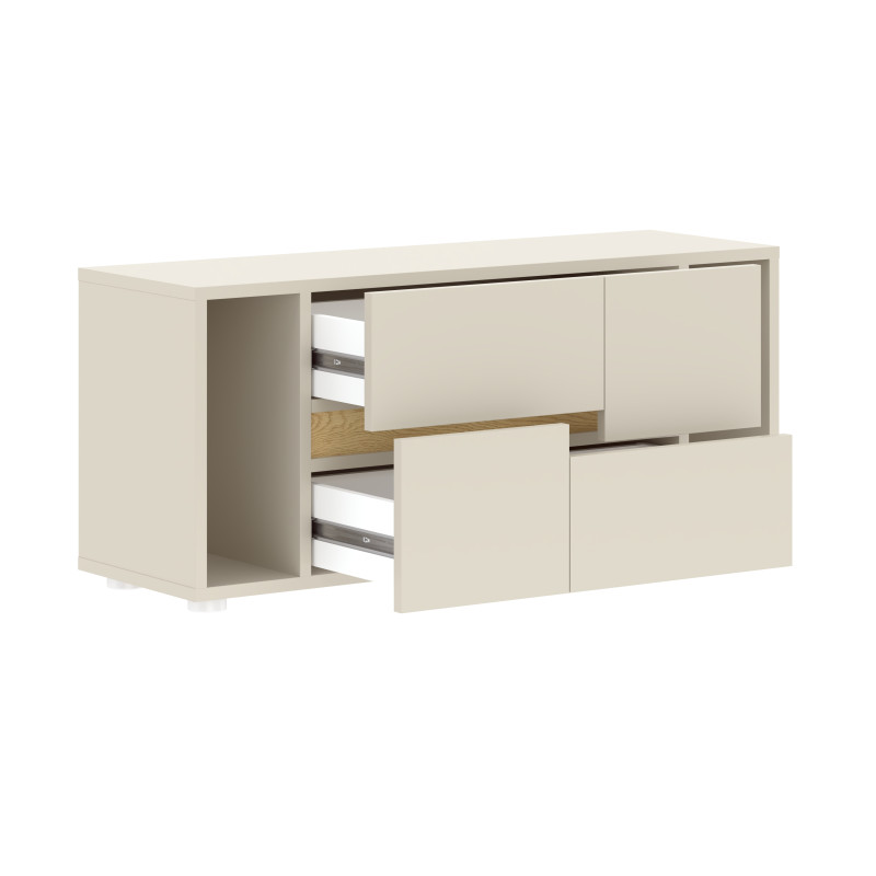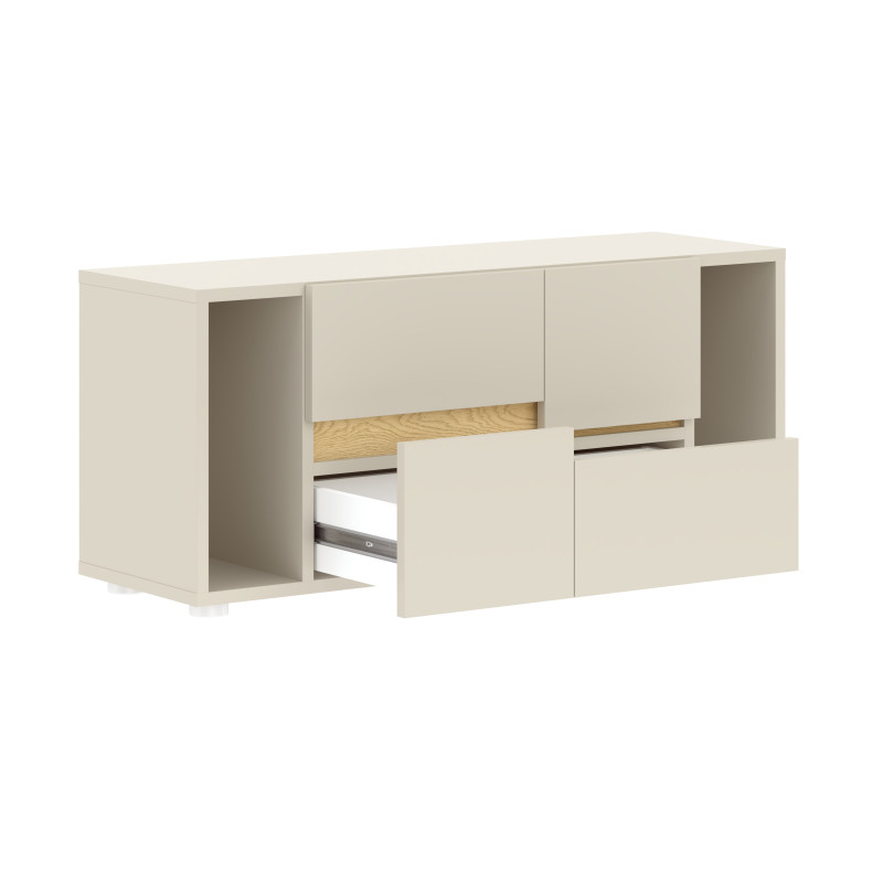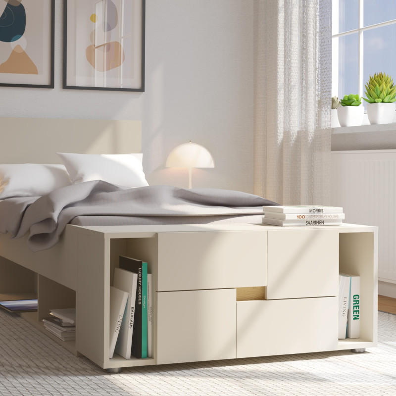 Skrzynia łóżka LENS 2S w kolorze kaszmir to praktyczny dodatek, który zapewnia dodatkowe miejsce do przechowywania bez zajmowania cennej przestrzeni. Dwie pojemne szuflady z łatwym otwieraniem poprzez frezowany otwór sprawiają, że mebel jest nie tylko funkcjonalny, ale i estetyczny. Delikatna listwa w odcieniu Dąb Cremona dodaje mu subtelnego, naturalnego akcentu.