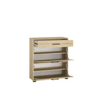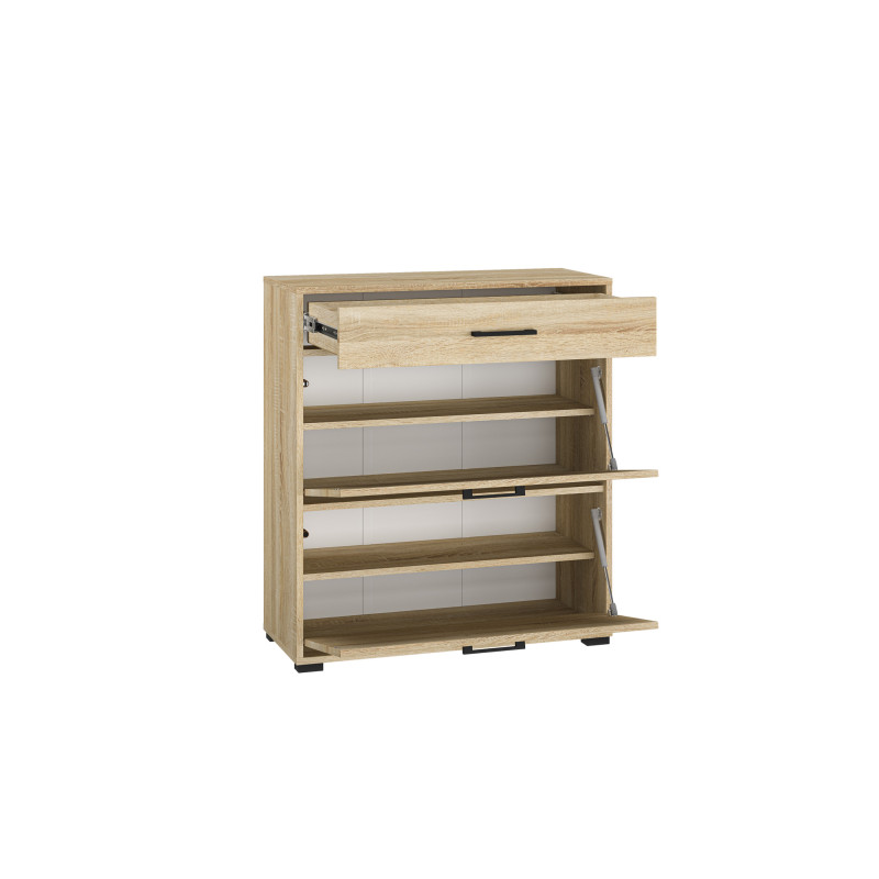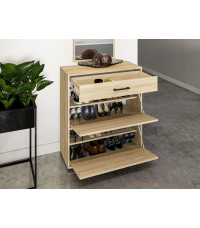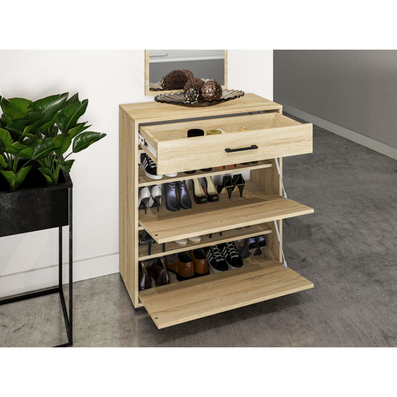 Szafka na buty Caro 10 jest optymalnym rozwiązaniem do każdego przedpokoju. Mebel tworzą cztery pojemne wnęki, w których przechowasz swoje buty. Szafka otwierana jest od góry. Klapy wyposażone są w nowoczesne siłowniki gazowe, które znacząco zwiększają komfort codziennego użytkowania Bryła zakończona jest dużą szufladą, w której schowasz np. kluczyki do samochodu czy przybory do butów. Całość wieńczy szeroki blat, na którym ustawisz ulubione dekoracje czy odłożysz drobne przedmioty, po wejściu do domu.