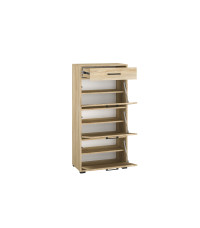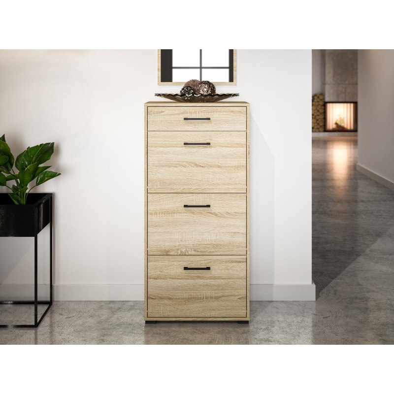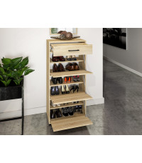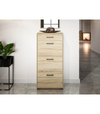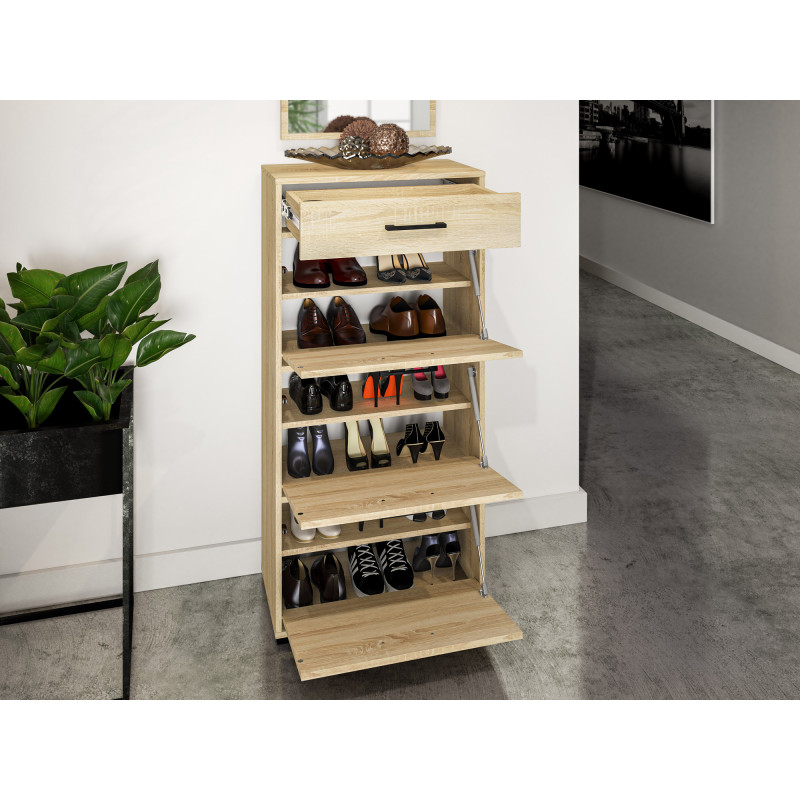 Wysoka szafka na buty Caro 14 jest optymalnym rozwiązaniem do każdego przedpokoju. Mebel tworzy sześć pojemnych wnęk, w których przechowasz swoje buty. Szafka otwierana jest od góry. Klapy wyposażone są w nowoczesne siłowniki gazowe, które znacząco zwiększają komfort codziennego użytkowania Bryła zakończona jest wygodną szufladą, w której schowasz np. kluczyki do samochodu czy przybory do butów. Całość wieńczy kompaktowy blat, na którym ustawisz ulubione dekoracje czy odłożysz drobne przedmioty, po wejściu do domu.
