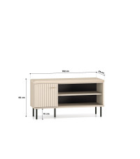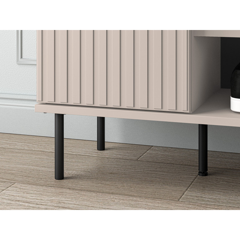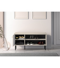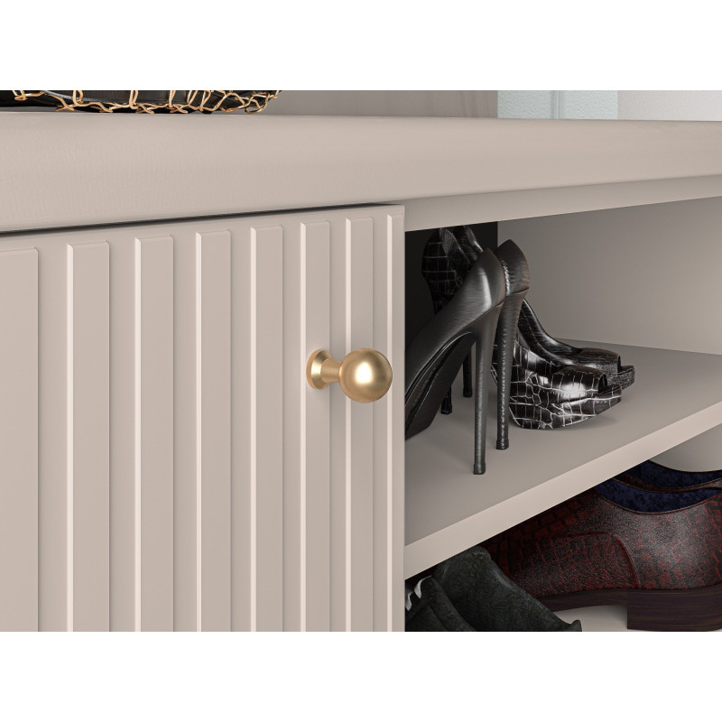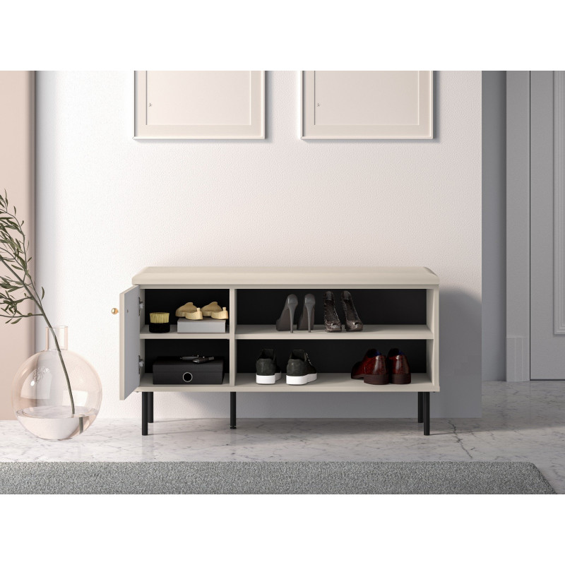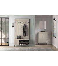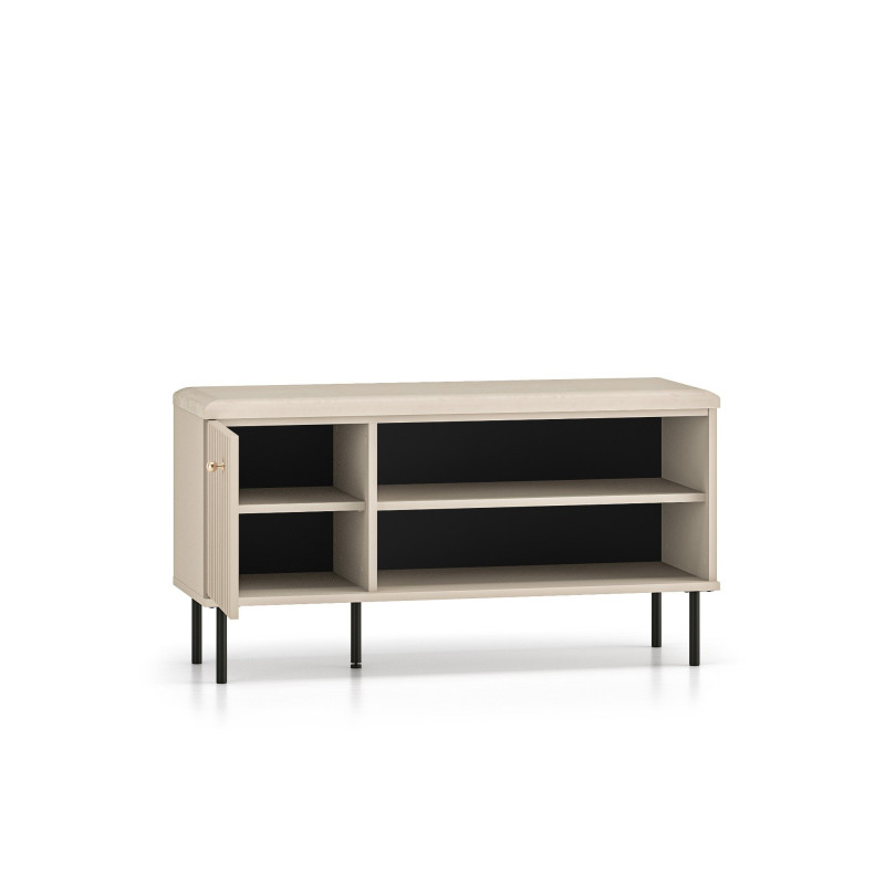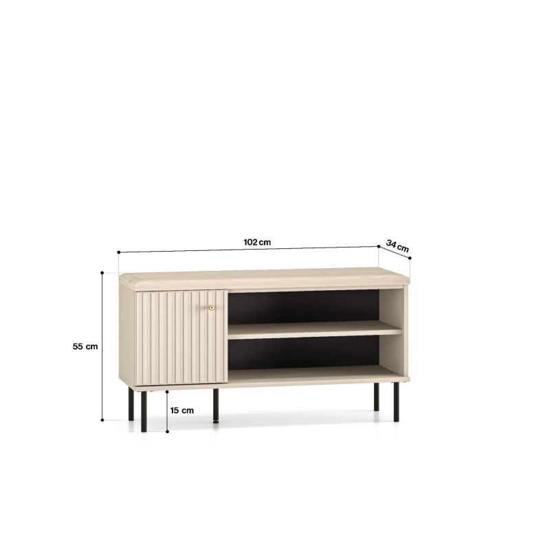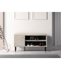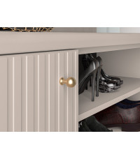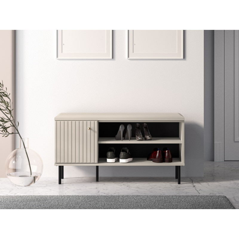 Szafka na buty Sophie od ML Meble to kompaktowe i eleganckie rozwiązanie do przechowywania, które łączy funkcjonalność z luksusowym designem. Kaszmirowe fronty MDF z ozdobnymi, frezowanymi lamelami nadają jej wyjątkowy charakter, a solidna konstrukcja z laminowanej płyty zapewnia trwałość i odporność na codzienne użytkowanie. Przestronna wnęka pod siedziskiem oferuje praktyczne miejsce do przechowywania, pomagając utrzymać porządek w przedpokoju. Dodatkowo wysokie, czarne nogi dodają lekkości konstrukcji i ułatwiają sprzątanie pod meblem.