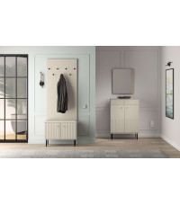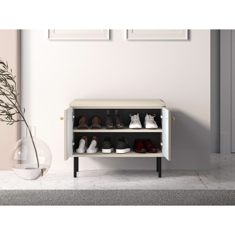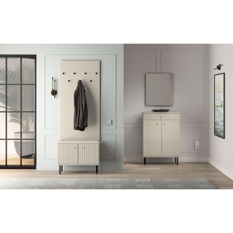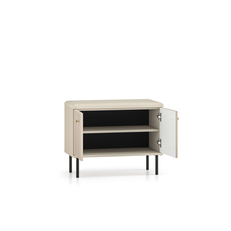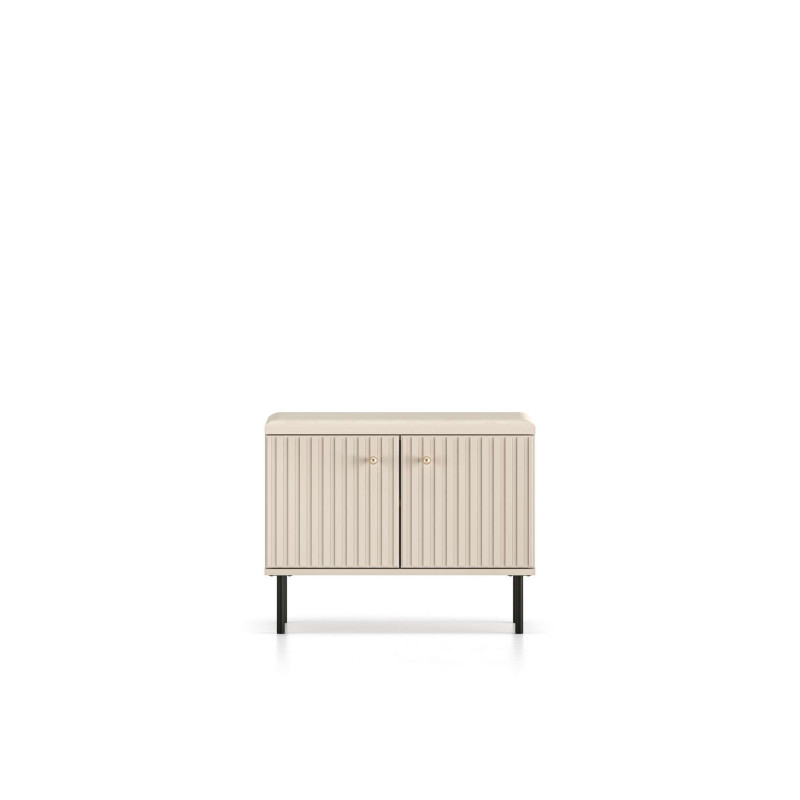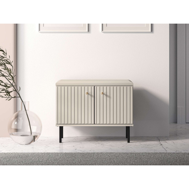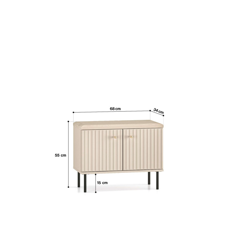 Szafka na buty Sophie od ML Meble to kompaktowe i stylowe rozwiązanie do przechowywania, które łączy funkcjonalność z nutą luksusu. Kaszmirowe fronty MDF z ozdobnymi, frezowanymi lamelami nadają jej elegancki wygląd, a solidna konstrukcja z laminowanej płyty zapewnia trwałość i odporność na codzienne użytkowanie. Pojemna przestrzeń pod siedziskiem umożliwia wygodne przechowywanie różnych przedmiotów, pomagając utrzymać porządek w przedpokoju. Dodatkowo wysokie, czarne nogi dodają meblowi lekkości i ułatwiają sprzątanie pod jego powierzchnią.