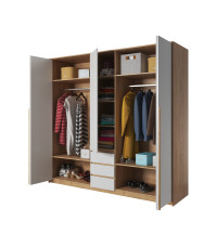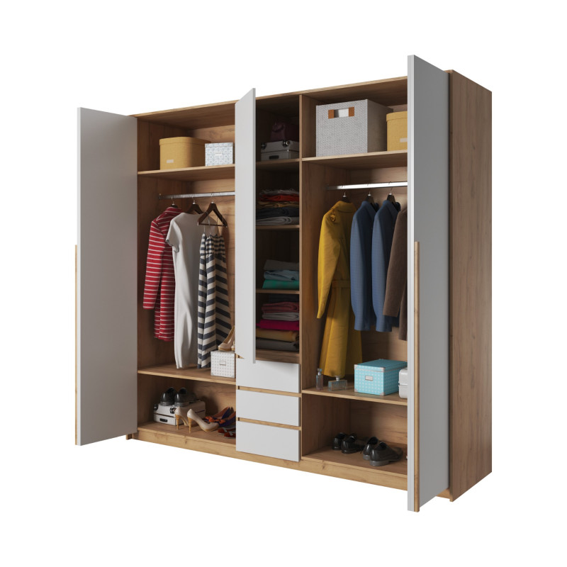 Szafa Xelo 230 o szerokości 225 cm, wysokości 213,5 cm i głębokości 60 cm wykonana jest z laminowanej płyty wiórowej o grubości 16 oraz 22 mm, zabezpieczonej obrzeżem ABS, co gwarantuje trwałość i odporność na uszkodzenia. Mebel wyposażony jest w innowacyjny system drzwi przesuwno-składanych WingLine, który ułatwia dostęp do wnętrza i pozwala oszczędzić miejsce w pomieszczeniu. Fronty szafy zdobią eleganckie uchwyty z MDF, które podkreślają minimalistyczny i nowoczesny charakter kolekcji. Szafa jest dostępna w modnym połączeniu białego matu i ciepłego dębu craft złotego, co nadaje wnętrzu przytulności i naturalnego wyglądu. Choć oświetlenie LED w listwie ozdobnej jest dostępne jako opcja dodatkowa, pozwala ono na efektowne podkreślenie mebla i stworzenie przyjemnej atmosfery. Szafa Xelo 230 to świetne rozwiązanie dla osób ceniących połączenie praktyczności z nowoczesnym designem i możliwością indywidualnej aranżacji.