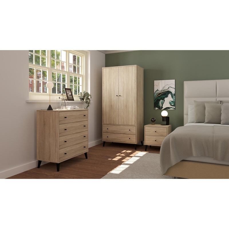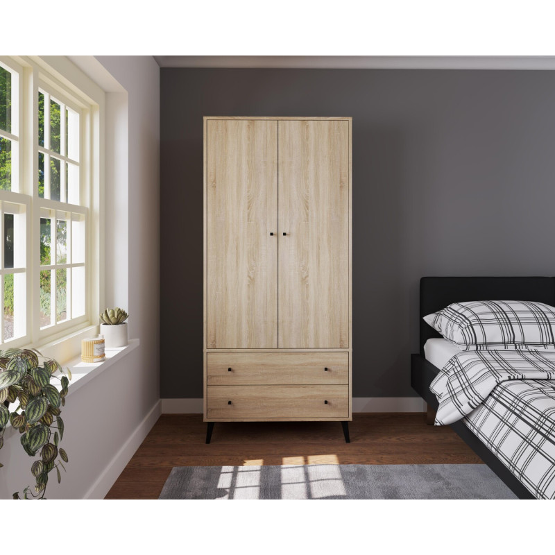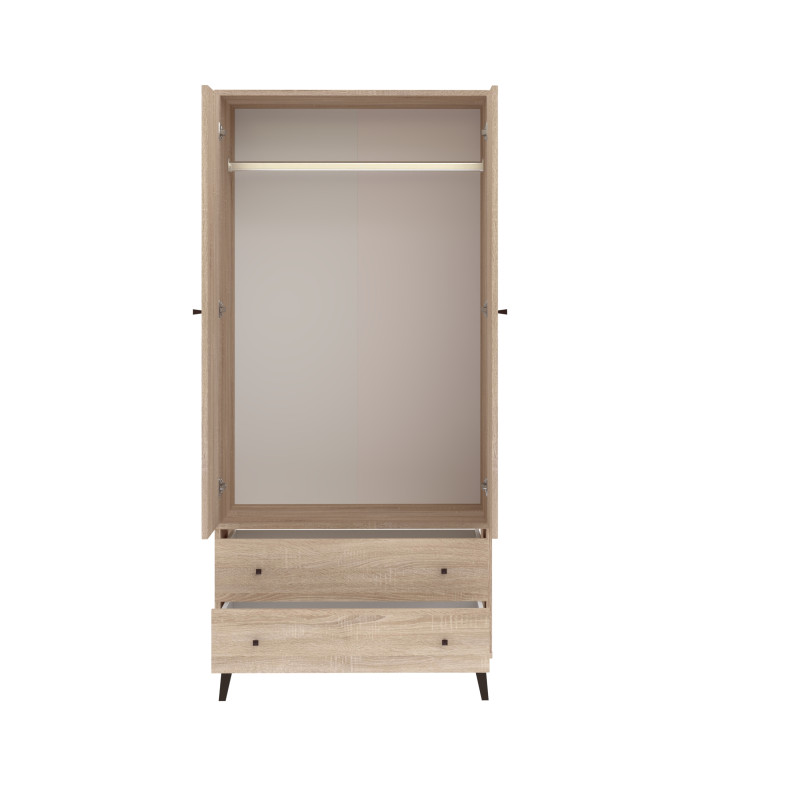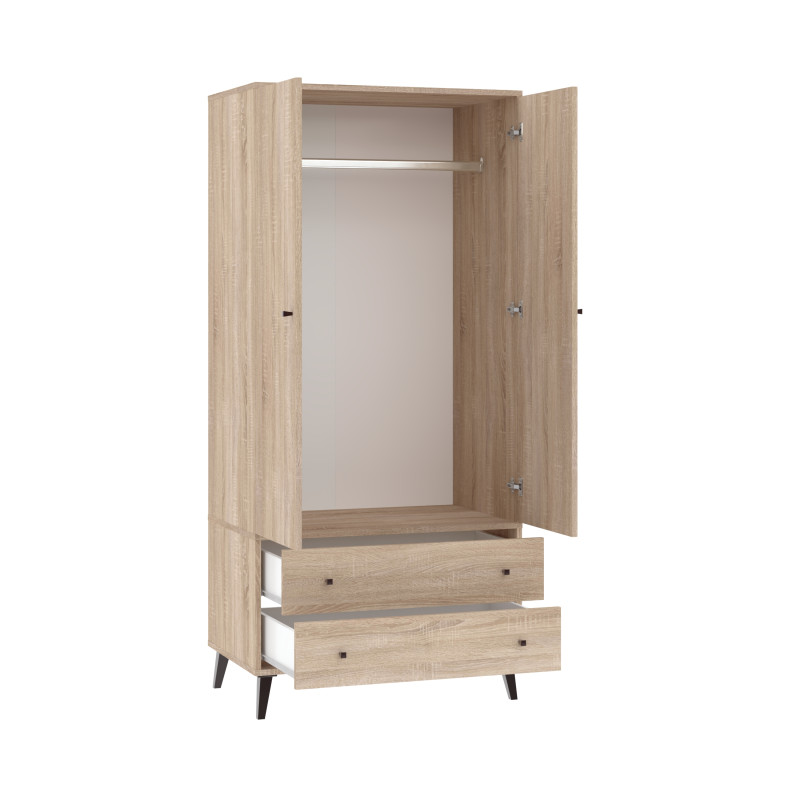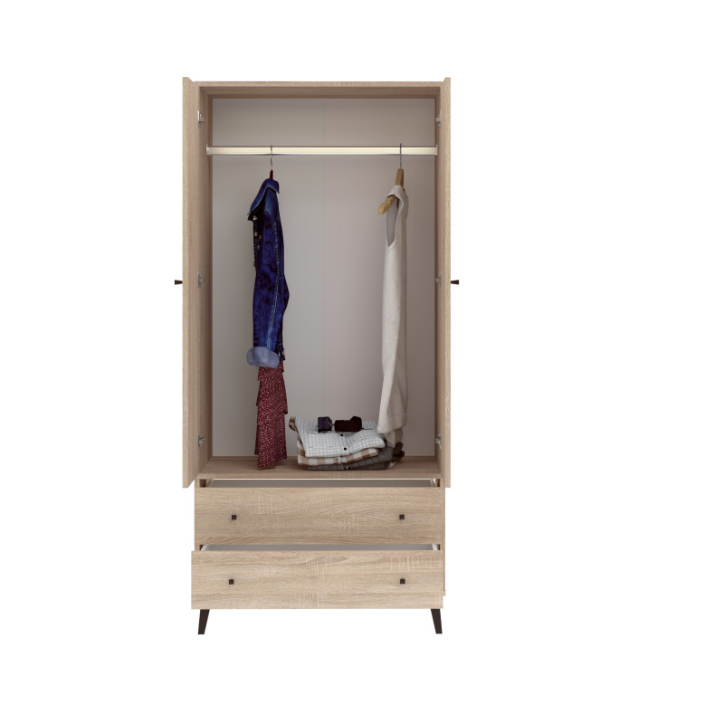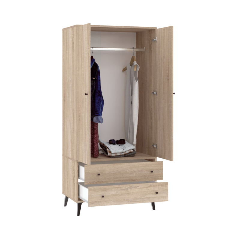 Szafa SALFORD w kolorze sonoma to funkcjonalne i stylowe rozwiązanie do przechowywania ubrań i dodatków. Dzięki pojemnym półkom, drążkowi na wieszaki oraz dwóm szufladom z łatwością uporządkujesz swoją garderobę. Jasne wykończenie ociepla wnętrze i sprawia, że pomieszczenie wydaje się przestronniejsze.