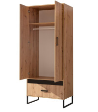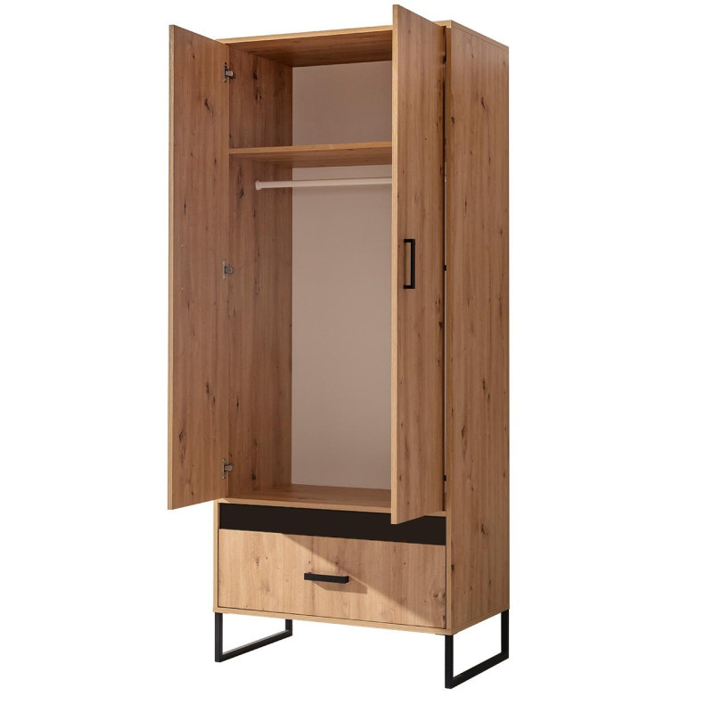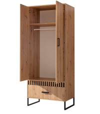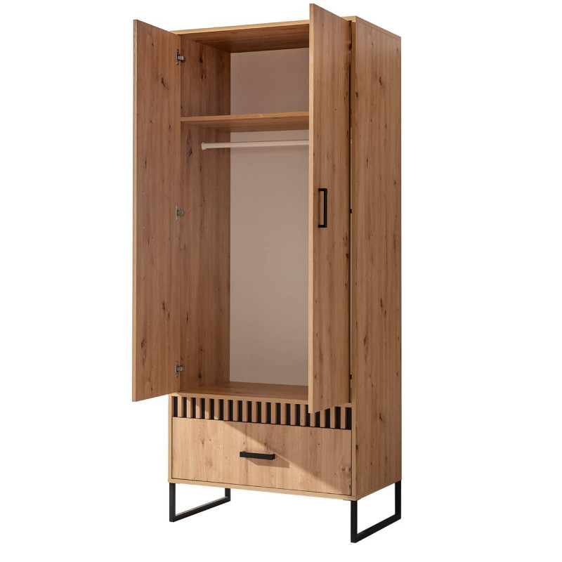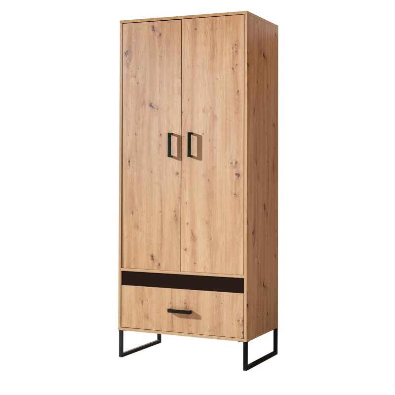 Szafa LAMELIX 01 to idealne rozwiązanie dla osób ceniących połączenie funkcjonalności z nowoczesnym designem. Model marki Domel z kolekcji LAMELIX wyróżnia się eleganckim, solidnym wykonaniem, doskonale pasującym do wnętrz w stylu loftowym i nowoczesnym. Dzięki zastosowaniu wysokiej jakości laminowanej płyty meblowej, mebel charakteryzuje się trwałością oraz odpornością na zarysowania i wilgoć, co gwarantuje jego długowieczność. Szafa ma wymiary 80 cm szerokości, 196 cm wysokości i 50 cm głębokości, co zapewnia dużą pojemność. Jej układ obejmuje dwudrzwiową część oraz przestronną szufladę, umożliwiając efektywne przechowywanie odzieży i drobnych przedmiotów. Matowe fronty dodają elegancji, a ozdobne lamele podkreślają nowoczesny charakter mebla. Precyzyjne wykonanie i dbałość o detale to jedne z głównych atutów szafy LAMELIX 01. Metalowe uchwyty i nogi nadają jej industrialny wygląd, a naturalna kolorystyka w odcieniu dąb artisan harmonijnie komponuje się z różnymi aranżacjami wnętrz, dodając im ciepła i elegancji. To funkcjonalny, stylowy mebel, który łączy wysoką jakość wykonania z nowoczesnym designem, sprawdzając się w sypialni, salonie czy innych pomieszczeniach, gdzie liczy się zarówno estetyka, jak i praktyczność.