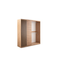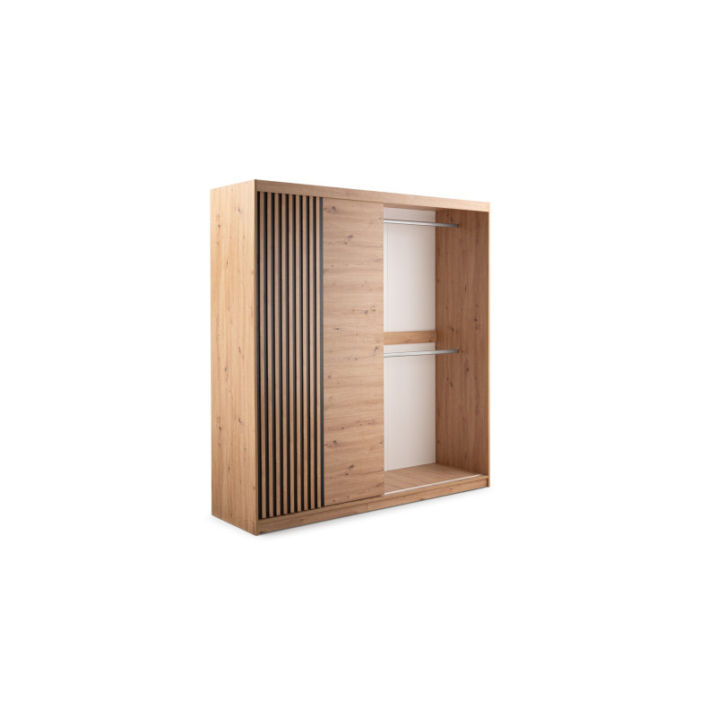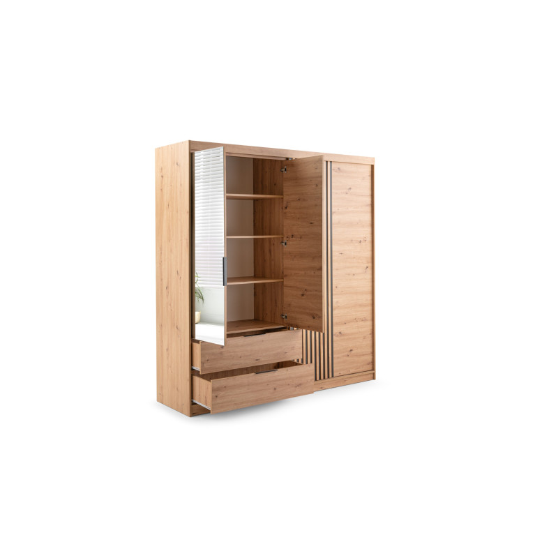 Szafa Majorka to elegancka i funkcjonalna meblościanka w kolorze dąb Artisan z czarnymi lamelami na frontach. Oferuje dużą pojemność dzięki drążkom na wieszaki, półkom i 2 dużym szufladom. Drzwi ozdobione są lustrami, dodając wnętrzu przestronności i stylu.