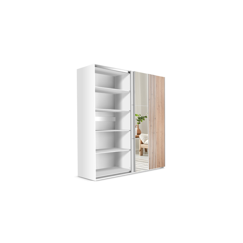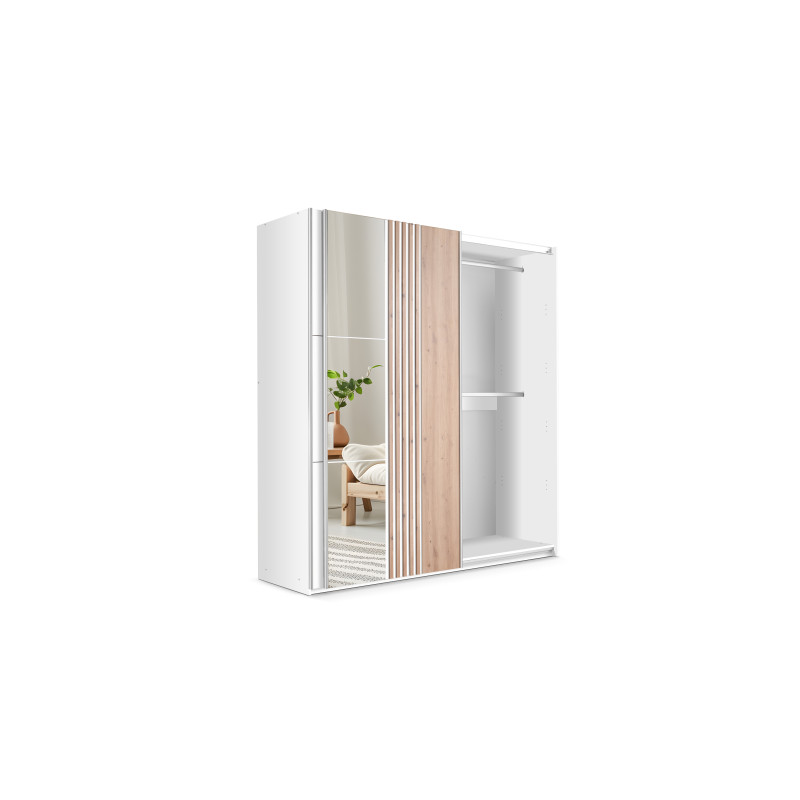 Szafa Sintra 203 w eleganckim połączeniu Biały / Dąb Wotan z lustrem to funkcjonalny i stylowy mebel do każdej sypialni czy pokoju. Przesuwne drzwi i dekoracyjne lamele łączą praktyczność z nowoczesnym designem. To rozwiązanie, które zapewni dużo miejsca do przechowywania i doda wnętrzu wyrafinowanego charakteru.