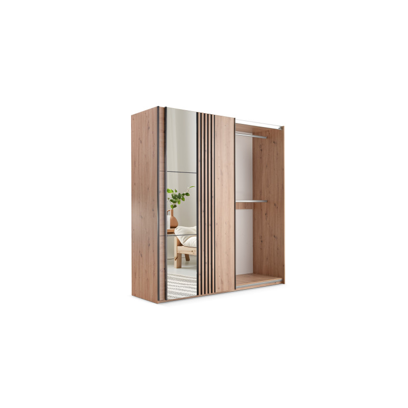 Sintra 200 to nowoczesna szafa z przesuwnymi drzwiami, dużym lustrem i dekoracyjnymi lamelami, dostępna w dwóch eleganckich wariantach kolorystycznych. Idealna do stylowych wnętrz, zapewnia funkcjonalność i dużo miejsca do przechowywania.