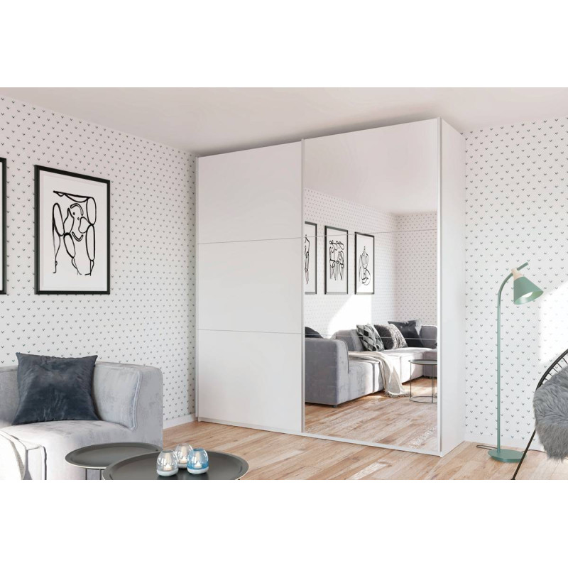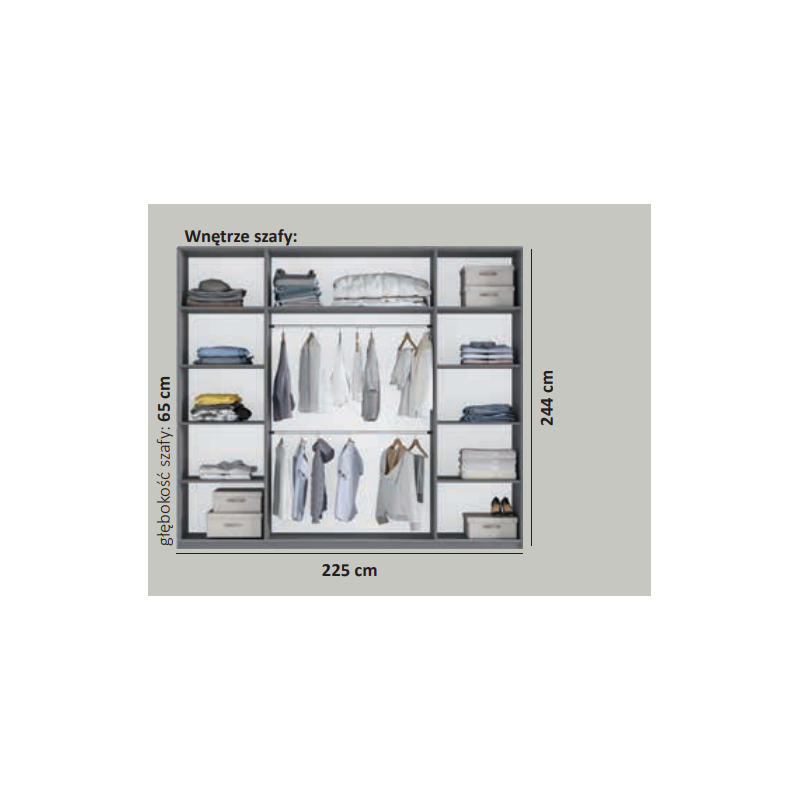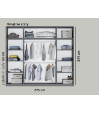 Szafa Rodos 225 to doskonałe rozwiązanie dla osób ceniących uniwersalny design i funkcjonalność. Świetnie sprawdzi się w sypialni, pokoju młodzieżowym lub garderobie, zapewniając wygodne i uporządkowane przechowywanie. Wyposażona w system drzwi przesuwnych, szafa gwarantuje komfortowe użytkowanie na co dzień. Jej front zdobi duże lustro, które nie tylko pełni funkcję dekoracyjną, ale także optycznie powiększa przestrzeń. Wnętrze szafy zostało starannie zaprojektowane, oferując liczne półki oraz dwa drążki na wieszaki, co umożliwia wygodną organizację odzieży i akcesoriów.