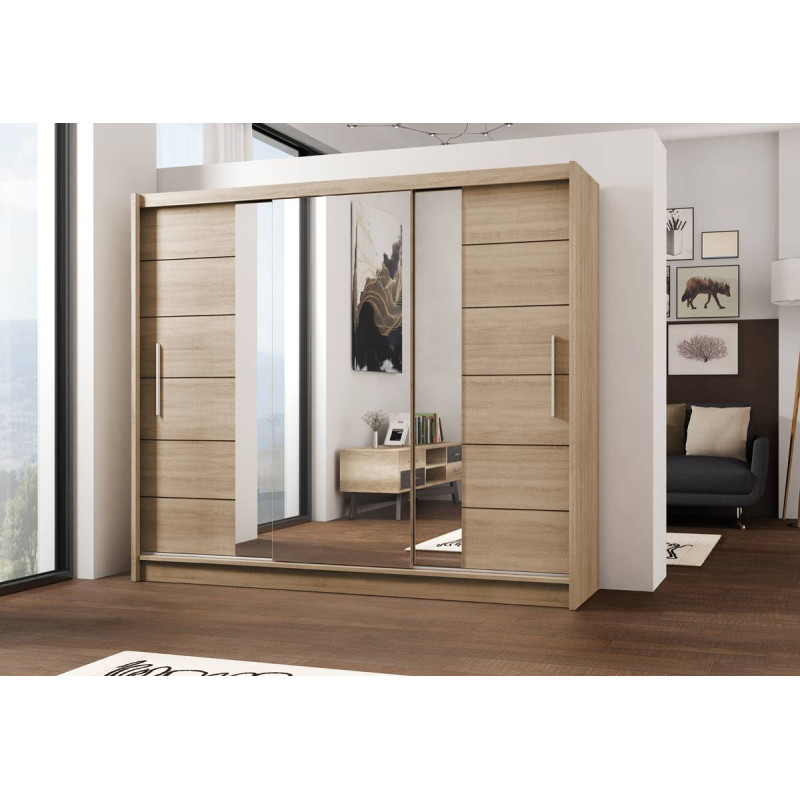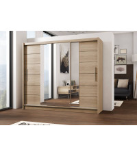 Szafy Lizbona II to eleganckie i funkcjonalne meble, które doskonale wpasują się w aranżację sypialni lub garderoby. Ta przestronna szafa przesuwna zapewnia dużą pojemność, umożliwiając wygodne przechowywanie ubrań, butów i akcesoriów. Dostępna w dwóch szerokościach – 203 cm i 250 cm – pozwala dopasować rozmiar do indywidualnych potrzeb. Fronty i korpus szafy wykonano z wysokiej jakości laminowanej płyty meblowej, co nadaje jej elegancki wygląd i ułatwia utrzymanie w czystości. Lustra na frontach optycznie powiększają pomieszczenie i dodają mu jasności, pełniąc jednocześnie praktyczną funkcję. Wnętrze szafy zostało zaprojektowane z myślą o wygodzie użytkowania – wyposażono je w drążki na wieszaki i półki, a w modelu o szerokości 250 cm dodatkowo przewidziano szuflady. System drzwi przesuwnych oparty na aluminiowych prowadnicach zapewnia płynne działanie i trwałość użytkowania przez długie lata. Szafa Lizbona II dostępna jest w kolorystyce bieli i dębu sonoma, co sprawia, że doskonale komponuje się zarówno z nowoczesnymi, minimalistycznymi wnętrzami, jak i klasycznymi aranżacjami. To stylowe i praktyczne rozwiązanie, które wniesie do Twojego wnętrza elegancję i funkcjonalność.